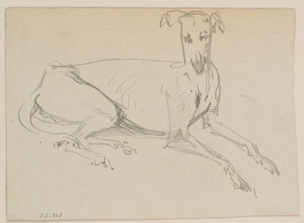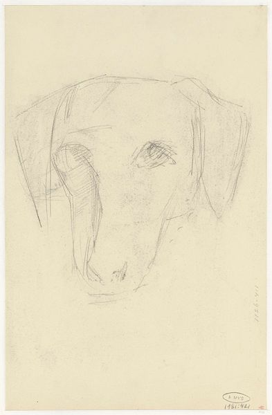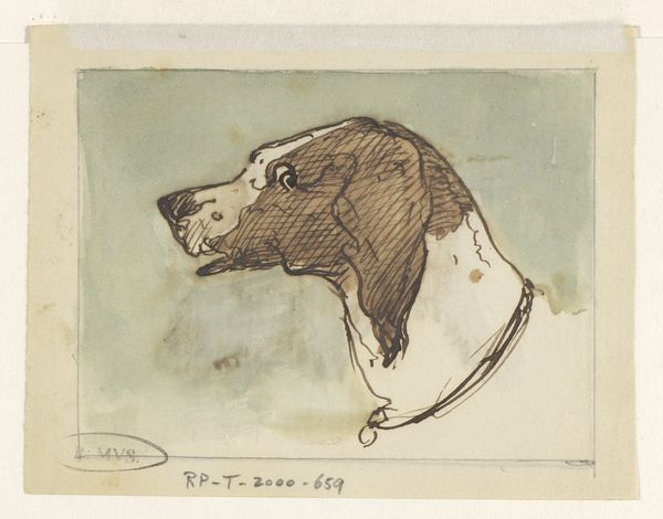 Curator: Johannes Tavenraat gifted us this pen and ink drawing in 1876. Titled simply, "Head of a Dog," it’s currently part of the Rijksmuseum collection. Editor: It’s such an economical image! Just a few strokes of ink and instantly, you perceive the sad, patient, watchful nature of the animal. There is something inherently moving. Curator: Indeed. Considering the materials – common pen and ink – one might consider the circumstances of production. Was this a study? A commissioned piece, or a quickly sketched gift for a family member? Editor: Or a symbol? Dogs have such a powerful presence in art, often representing loyalty and fidelity, but also vigilance. Notice the eye – slightly enlarged, intense, almost anthropomorphic in its watchfulness. What do you make of it? Curator: Well, it's just ink on paper. But the paper itself offers clues. See how the edges are roughly cut? That suggests a readily available material, perhaps scavenged or leftover from other, more significant, artistic endeavors. This speaks of the practicality, the cost-effectiveness, and maybe even the lower social standing of animal portraiture at the time. Editor: Perhaps, or perhaps its informality speaks to the close relationship the artist has with his subject. Think of Argus, Odysseus' faithful hound. That loyalty, devotion—Tavenraat has caught it perfectly with the image of his patient watchfulness, despite the limitations of his artistic rendering, creating more empathy than fidelity. Curator: Limitations are always interesting— the type of ink would matter for how easily he could use it and apply it, wouldn't you agree? What sort of artisanal tools were available and how widely could the paper be disseminated at the time it was made. All things considered, you must admire how the artist uses simple resources, making what is accessible universally beautiful. Editor: Universally beautiful, perhaps because it strikes such a chord of emotional recognition in us even now. So much meaning evoked with the simplest of means. It's like the Platonic ideal of dogginess somehow shining through. Curator: Perhaps! Well, food for thought about what we consume versus what the materials that form the very groundwork of artistic output cost to procure!