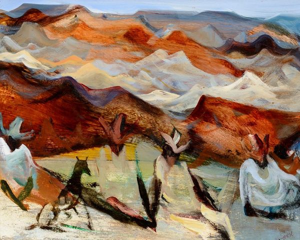 Martiros Sarian painted this view from the banks of the River Araks with oil on canvas using bold strokes and a warm, earthy palette. It's like he’s inviting us to witness a place where the land meets the sky in a dance of color. The physicality of the paint is really striking. Look at how Sarian loads the brush with generous amounts of thick, opaque color. You can almost feel the texture of the rugged terrain and the cool, blue sky. There, see how he drags the brush across the canvas in these long, sweeping gestures? It gives the landscape a sense of movement, as if the wind is constantly shaping the hills and mountains. Sarian’s work reminds me a little of Milton Avery, with its simplified forms and emphasis on color relationships. Like Avery, Sarian understands that art is less about representation and more about capturing the feeling, the essence of a place. It’s a conversation across time, where artists borrow, respond, and reinterpret ideas in their own unique way.