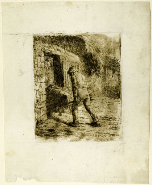 Editor: Here we have Charles Jacque's "Drinker," an etching printed on paper. It's a small print, yet the density of lines makes the scene feel claustrophobic. What strikes me most is how the artist chose to depict the realities of working-class life. How would you interpret this work? Curator: For me, this piece is deeply rooted in its materiality. It's an etching, a process requiring laborious work on a metal plate. Notice how the dense lines aren’t just representational but embody the effort poured into its making, reflecting, perhaps, the manual labor of the sitter’s life itself. Does the visible grain of the paper enhance that textural association for you? Editor: It does. It almost feels like burlap or raw canvas. What about the subject, though? Curator: Consider how the printmaking process made it possible for this genre scene to circulate amongst a broad audience, turning what may have seemed lowbrow—a man drinking in a simple interior—into an object of aesthetic consideration. This is key because Jacque subverts established hierarchies of subject matter. This work becomes less about the romantic notion of 'the drinker' and more about class and production: from the labour involved in its creation to how the art market interacts with portrayals of working people. How might contemporary viewers react? Editor: It definitely shifts the focus away from simply viewing the drinker as an individual and towards understanding the economic forces at play. It encourages you to consider the process. Curator: Exactly. Art, even in its 'humblest' forms such as prints made on paper, can lay bare the social relations of production. And conversely, we, in handling and contemplating a material artwork like this print, enter into a social relation of viewing and valuing. Editor: So it’s about recognizing the complex interplay between the creation, the subject, and the social context that gives it meaning. Thank you, that was insightful. Curator: And seeing it through your eyes offers new perspectives, too. It makes me consider what kind of paper would Jacque choose to print this subject with a higher density grain.