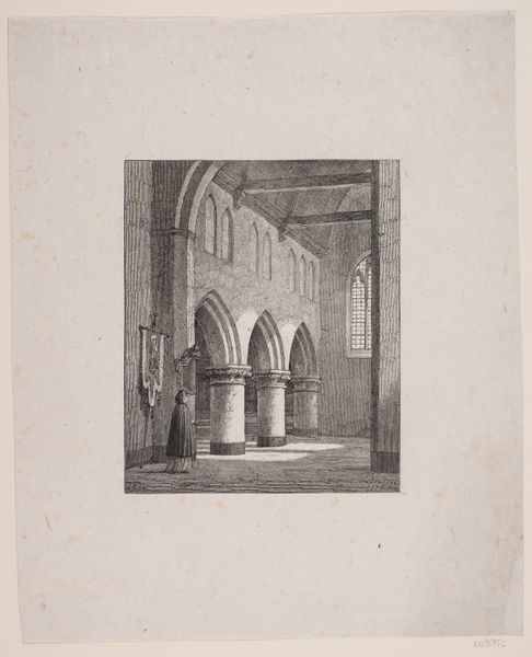 Curator: Jan Baptist Tetar van Elven created this engraving between 1831 and 1833, it is titled "Monument voor Jan Carel Josephus van Speijk". Editor: The print is rendered in very cool greys, almost ashen in quality. The composition centers a monument but it feels overshadowed by the vast architecture surrounding it. Curator: Yes, notice the meticulous engraving work to achieve that sense of scale and depth. Van Elven was very concerned with precision. Considering the labor involved in engraving those intricate lines for architectural accuracy tells us much about 19th-century printmaking's role in documenting and disseminating cultural and political narratives. Editor: I see how the crisp lines give a feeling of stark grandeur. Speaking of narratives, the historical context is quite complex here, isn't it? Jan van Speijk was a controversial figure in Dutch history, to put it mildly. His act, while seen as heroic by some, represents a very charged moment of colonial power. Curator: Absolutely. Consider the means by which images of figures like van Speijk circulated. These engravings like the monument itself became tools for constructing a certain national identity in post-Napoleonic Netherlands. We should also remember that printmaking enabled these heroic images to spread widely, molding popular opinions. Editor: It's intriguing to consider this in light of our own contemporary visual culture. What gets memorialized, how, and by whom – it’s all part of an ongoing conversation about historical narratives, especially in the face of the difficult legacies of colonialism. Even the decision to depict the monument within a massive church space underscores that this commemoration is tied to institutional power. Curator: Precisely. Examining such imagery compels us to question whose labor and stories were left out of this official historical record, whose voices were amplified by these engravings, and the underlying systems that sustained those choices. Editor: Definitely gives you pause, doesn’t it? Curator: Indeed. Looking closer helps us to ask the crucial questions around its making and lasting influence. Editor: Right, to see beyond the surface, as it were.