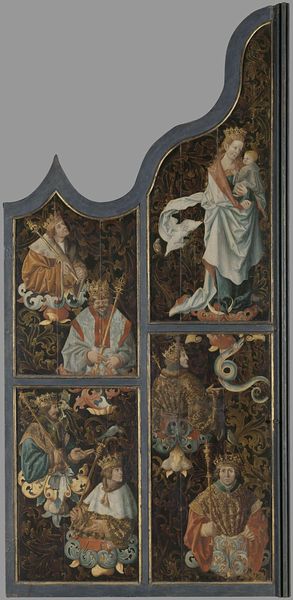 This is the right door of an organ, made from wood, which once belonged to the Dutch Reformed Church in Scheemda. Though the artist remains anonymous, the door likely dates back to the late 15th or early 16th century, a period of significant religious and cultural transition in the Netherlands. The panels depict regal figures playing musical instruments, alongside what appears to be an enthroned biblical character, perhaps King David. Notice how the artist uses visual cues such as crowns, fine robes, and musical instruments to indicate status and sophistication, reflecting the social hierarchies of the time. The presence of such an elaborate organ in a Reformed Church suggests a complex relationship between religious practice and artistic expression. To understand this artwork fully, we might consult church records, social histories of the Netherlands, and studies of the Reformation. This panel reminds us that art is always embedded in a specific social and institutional context.