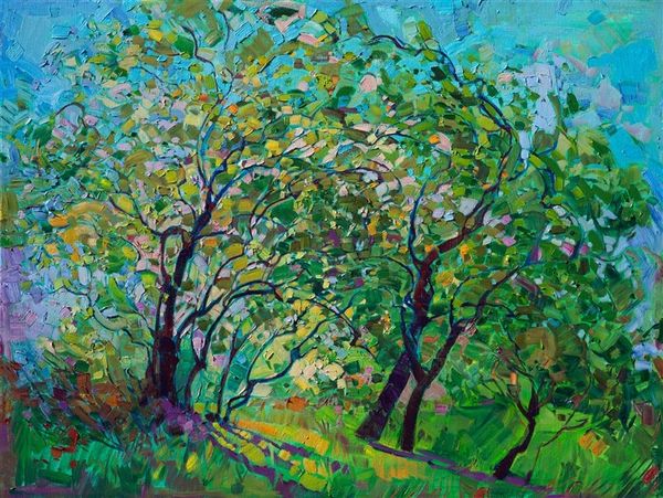 Endre Bartos made this painting of a thick forest with oil paint on what looks like canvas. There's a real immediacy to the marks, where the process feels laid bare. The texture in this painting is incredible; the brushstrokes feel thick and purposeful, creating a palpable sense of depth and movement. Look at the trunks of the trees, rendered in these bold, almost violet hues. The paint is so thick you can practically feel the weight of each stroke, evoking the density of the forest. Notice how the ground plane is built up of a patchwork of yellow and brown tones, juxtaposed with the blues and greens of the foliage. It feels like a direct and intuitive response to the landscape. Bartos’s work reminds me of the Fauvist painters, like Derain or Vlaminck, who weren't afraid to use color expressively, prioritizing emotional impact over realistic representation. Ultimately, what I love about this painting is how it embraces a kind of visual ambiguity. It celebrates the act of seeing and feeling over the need for definitive answers.
