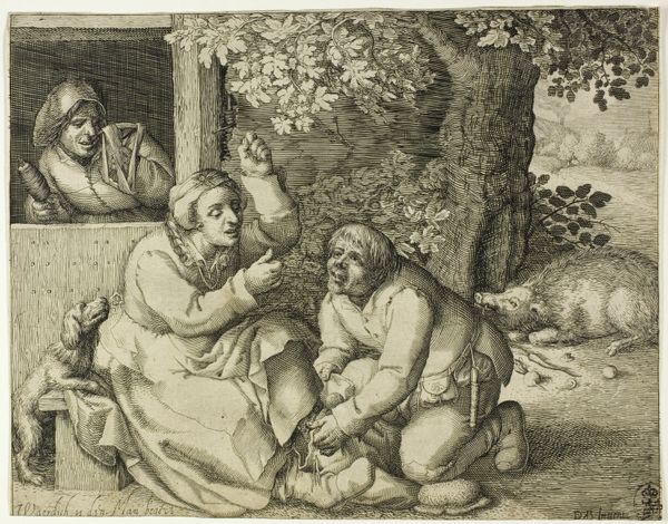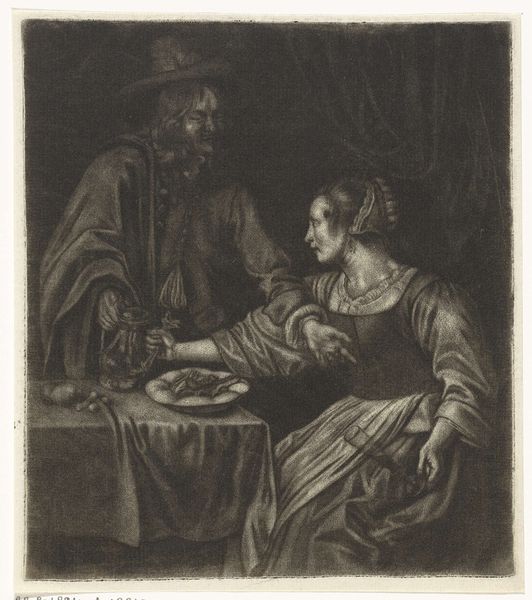 Editor: So, this is *Herbergscène met drie figuren bij een haard*, a tavern scene with three figures by a hearth, an engraving by Pieter Schenk made sometime between 1670 and 1713. The print, held at the Rijksmuseum, feels incredibly intimate, like peering into a candid moment. The way the figures huddle together almost obscures what they're doing, inviting curiosity... What catches your eye about this work? Curator: Oh, isn't it just brilliant how Schenk manages to capture that fleeting sense of warmth, both literally from the hearth, and figuratively in the connection between the figures! Look closely at the light and shadow play; it’s almost theatrical, drawing us into their shared moment, their little bubble, you might say. I’m struck by the faces; there is such sly joy, wouldn’t you say? Is it purely convivial, or is there something a little mischievous afoot, perhaps? The details hint at the story; what do you think that jug holds, and what has passed between them, do you think? Editor: I hadn't considered that potential mischief. The jug, I assumed wine, but maybe...something stronger? The ambiguity definitely makes it more interesting. The composition, too, seems carefully constructed to lead our eye towards their expressions, almost like eavesdropping. Curator: Exactly! And notice that while their expressions pull us in, the darkened background— the suggestive textures of hanging garments— allows our imaginations to run wild. I often wonder, when gazing into scenes like this: are we glimpsing a shared human truth that echoes across centuries? What secret joke might they be sharing? Editor: I hadn’t considered that deeper sense of shared experience across time. The darkness now seems like more than just background; it hints at hidden stories. Thanks; that completely shifted my understanding. Curator: Precisely. Art’s a mirror, isn't it? It reflects our own selves, back through the ages!