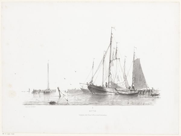 Johan Conrad Greive created this work titled 'Kaag' with etching. Imagine yourself in the Netherlands during the 19th century, a time when the country was deeply connected to its waterways and maritime activities. Greive, working in this environment, captures more than just a scene, he gives us a portrait of Dutch life. The etching depicts a tjalk, a traditional Dutch barge, resting in the calm waters of Kaag. The print evokes a sense of serenity and stillness, yet it also quietly speaks of the labor and trade that were the lifeblood of the Dutch economy. The barge itself, with its flat bottom and sturdy build, was essential for navigating the shallow Dutch waterways. These vessels were often family-run, with women playing a crucial role in managing the boat and its cargo. 'Kaag' encourages us to reflect on the intersection of labor, family, and identity in the maritime culture of the Netherlands. It is a snapshot of a world where the rhythms of daily life were intimately tied to the water.