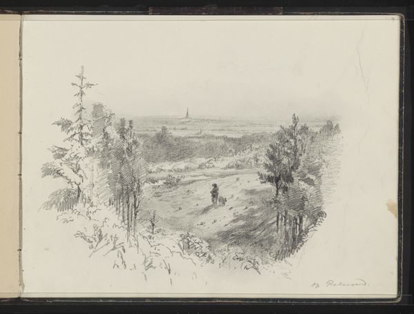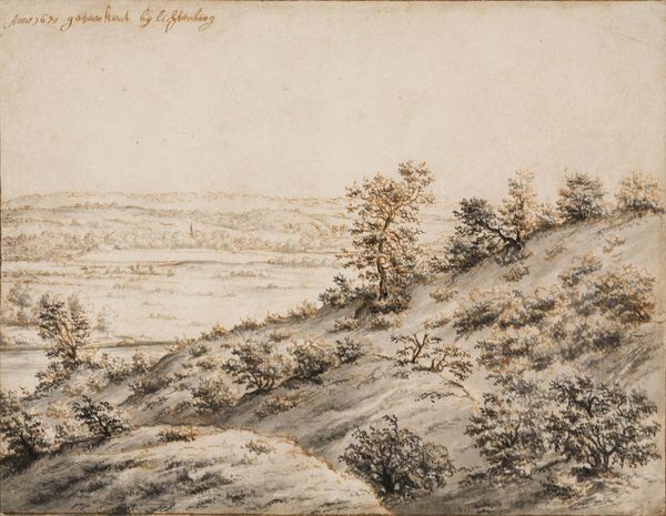 Curator: Johannes Tavenraat created this work titled “Gezicht op Kleef” in 1833. It's currently held at the Rijksmuseum. What's your initial read on it? Editor: Breezy! Feels like one of those days when you can smell rain coming, but the sun’s still teasing you. A little melancholic, maybe? I keep getting snagged on those twin spires on the horizon; it's like the town is stretching, reaching up. Curator: It’s a watercolor, a medium lending itself to atmospheric perspective. Note the artist's choice to soften the town's details, creating a spatial recession which enhances the depth of the composition and the illusion of distance. Editor: Exactly. Everything's muted, dreamy, almost out of reach. Even the foreground, those slopes, seem to point the eye toward the center, that stand of trees shielding whatever is going on there, toward what, presumably, is Kleef. The brushstrokes almost vibrate, a sort of stillness rippling through the landscape. I guess I like the push and pull between intimacy and isolation it evokes. Curator: Tavenraat’s manipulation of light reinforces that sentiment, drawing the viewer’s eye through a carefully orchestrated series of tonal variations. Light and dark areas alternate—a formal device designed to direct our gaze and maintain our interest. This work uses muted tones. There is a limited color palette. Editor: Which is funny, because I also feel the urge to add in, or to pump up, certain shades to give it more color, but its austerity does make for an almost ethereal feel... Makes you wonder what else Tavenraat saw but chose to leave out. What kind of stories he felt that the land was keeping at that moment? Curator: A point well-taken. It’s in these calculated omissions, or rather artistic choices, that the Romantic sensibility finds its most compelling expression. By reducing specific elements, a semiotic field emerges, ripe for subjective interpretation. Editor: Mmm, so, like, Kleef as a state of mind as much as an actual place, then. Thanks. Now, when I go, I can really see and not just glance at it on the wall here. Curator: Precisely. Perhaps we can now move to another…