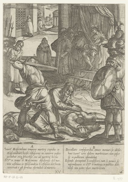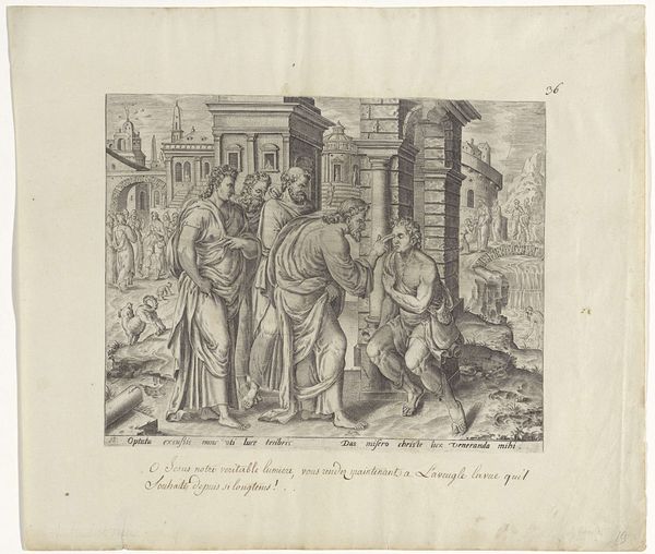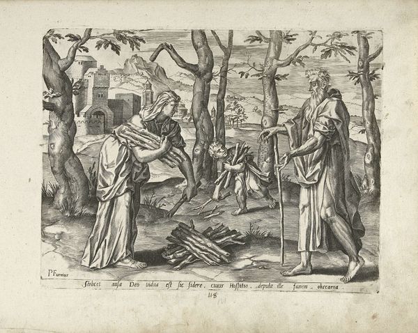 Curator: Standing before us is an intriguing piece from the Rijksmuseum's collection: an etching titled "Gelijkenis van de schat in de akker," dating roughly between 1585 and 1643, and attributed to an anonymous artist. Editor: The starkness of the lines and shading immediately conveys a somber mood. The artist's sharp contrasts in light seem deliberate. Curator: It's an allegorical scene rooted in religious teachings, referencing the parable of the hidden treasure. Notice the figure unearthing the treasure in the field and then the subsequent transaction with other men near a gateway. The image would be easily legible for those familiar with biblical stories, reinforcing social values related to faith and commerce. Editor: Observe how the figures are placed: their physical closeness seems almost theatrical, amplifying the emotional charge, almost to an extreme. The background elements - the buildings and distant landscape - fade slightly, creating depth but keeping us fixated on their interaction. Curator: The distribution and interpretation of these biblical narratives were often controlled by institutions to shape public perception of faith and moral behavior. So, while the artist is anonymous, understanding its societal implications provides insight. Editor: Absolutely, but consider purely the etching technique: observe how lines create value, form, and depth - from light highlights to nearly opaque shadows. The lines' variable thicknesses enhance details in the characters and also add layers. Curator: Exactly, the image served a function in a larger historical and social context—it helped translate these ideas into accessible form, contributing to its broader appeal. Editor: In any case, its compelling composition draws the eye, inviting the observer to scrutinize every detail of the characters and plot implied within. Curator: A small but poignant illustration of the intersections of faith and earthly gain that still affect contemporary values. Editor: Leaving me to admire its compositional rigor!