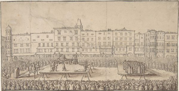 Editor: This is "Combat of the Infantry," an etching by Jacques Callot. It's incredibly detailed, almost like a bird's-eye view of a staged battle. What symbols or meanings do you think Callot embedded within this scene? Curator: Notice how the figures are arranged within a circle, like a theatrical arena. This shape evokes ideas of ritual, performance, and even sacrifice, reminiscent of ancient Roman gladiatorial contests. What memories, you think, was Callot trying to conjure? Editor: Perhaps he’s contrasting the spectacle of war with the controlled environment of a performance. Curator: Precisely. The image blurs the line between reality and representation. Consider the individual figures—each with distinct gestures, yet acting as a collective. Might that suggest the erasure of individuality within the theater of war? Editor: That's fascinating. I hadn't considered the loss of identity within the larger spectacle. Curator: The image carries with it a cultural memory of violence, even as it’s presented as entertainment. Callot invites us to confront the complex interplay between observation, participation, and the enduring symbolic weight of conflict.