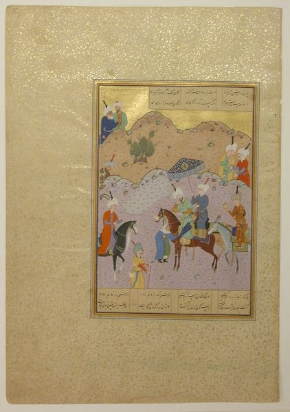 Editor: So, here we have "Royal Horse Inspection" from the late 17th century, during the Safavid dynasty. It's a painting and drawing on paper by ‘Aliquli Jabbadar, and it's currently held at the Art Institute of Chicago. It feels… like organized chaos, all these people and horses crammed into a small space, a meticulously framed world buzzing with energy! What strikes you most about this miniature? Curator: It's like stumbling upon a hidden world, isn’t it? For me, the sheer vibrancy pops. You've got this elite assessment taking place on top and all the controlled commotion down below. Look at those colours, those details - especially in the textiles. I am often blown away by how the artists capture depth in such flattened spaces. Does this forced perspective draw your eye at all? Editor: Absolutely, the layering effect is stunning. The figures feel both present and distant at the same time. All that to say that with such detail comes the questions: what exactly do all the happenings communicate to us, beyond simply ‘royalty checking out horses?’ Curator: It's a dance of power, really. Think about it: a dynasty projecting its strength, flaunting wealth and mastery through something as integral as their horses. This isn't just a checklist; it's theater. What do you think about the horse, does that feel symbolic at all? Editor: Hmmm. They do take up a substantial portion of the space... symbols of status, of course, but they are literally the engine of power. A lot to ponder. Curator: Yes! It's a glimpse into their entire ethos of both beauty and dominance. Editor: That’s great! Now I see it. A lot more to consider in this miniature painting than I initially thought! Thanks. Curator: Indeed. I find myself rethinking it with you too! There's just a wealth of knowledge captured in this small window into a bygone era.
