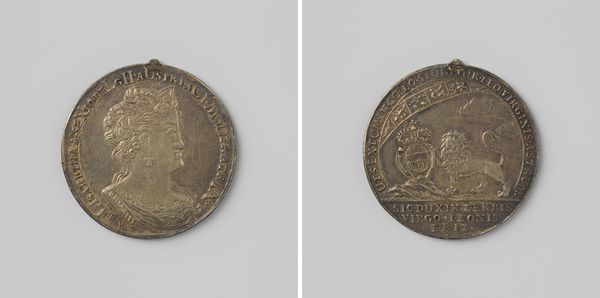 Curator: Editor: Here we have Philippe Roëttiers’ medal, "Inhuldiging van Filips V te Brussel," crafted in 1702. Looking at the image, the wear on the metal, I find myself wondering about how the making of this piece reflects the political situation it represents. What does it tell us? Curator: A materialist perspective makes us ask about the very stuff of this medal. This wasn't painting or sculpture crafted from readily abundant or renewable materials, but one employing precious metals. What implications does that have, both regarding its purpose and its audience? What did it mean to mint a coin to memorialize an event? Editor: It implies that wealth was central. It also shows how the image, a symbol of royal power, could circulate. But was there a risk that, being so small and common, it would somehow cheapen the King's image? Curator: An excellent question. It challenges assumptions about value. Consider the labour involved in its production: the mining, refining, engraving, minting, and distribution. How were laborers in the silver mines connected to this moment of royal self-fashioning? That distance makes it both valuable and meaningless in a way, doesn't it? Editor: It does. It highlights the social cost behind royal display, making me consider who directly benefitted versus who was exploited through these types of commemoration pieces. It suggests an uneven distribution of benefits at play in the King's reign. Curator: Exactly. By tracing the material life of the object, we illuminate a more complex and less romanticized view of royal power, and how such an image can be used for celebration and oppression at the same time. The piece takes on more meaning as it represents so many facets and interpretations through its materials.