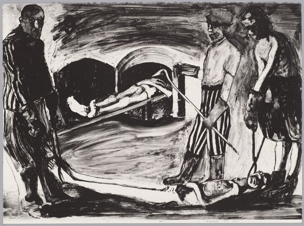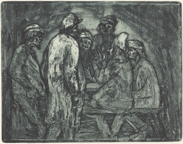 Curator: Here we have John Thomas Biggers' "Composition," a print rendered in ink, dating to 1952. Editor: It strikes me immediately as heavy with weariness. The figures seem burdened, heads bowed low. It’s stark and somber. Curator: Indeed. Biggers was deeply invested in depicting the Black experience in America, often reflecting the socio-political climate. His work promoted self-determination and cultural pride during the Civil Rights Movement. The Black Arts Movement certainly resonated through his career. Editor: Look at the hands—so prominent, almost skeletal. Hands that have worked, created, and endured. The way the light catches them amidst the darkness feels symbolic, a glimmer of hope perhaps. It could be about the endurance of cultural heritage. Curator: Absolutely, and Biggers explored themes of community, family, and resilience, consciously rejecting negative stereotypes prevalent in mainstream media. Consider also the composition itself – the figures are densely packed, their forms overlapping, conveying both unity and the claustrophobia of their circumstances. Editor: And their downcast eyes, I wonder what it meant to the communities of the time to see figures resembling themselves so truthfully represented? What stories did it provoke or make viewers think of at the time of release and display? Curator: The image operated in public discourse both as a reinforcement of common struggles, but also as a reminder that these were scenes from their life, rather than imagined circumstances to which some might not understand. Its availability to Black audiences promoted self determination by offering artistic representation of that struggle in daily life, allowing for communities and organizers to feel that sense of unity and the confidence that stems from such collective empathy. Editor: So, beyond the literal figures, the drawing seems to act as a collective reminder of both loss and the path to cultural advancement in times of public inequality. The print reminds communities that the only path to that future goes directly through communal empathy and understanding. Curator: I agree completely; the cultural and socio-political impact this piece had at the time certainly reverberates even now. Editor: Absolutely, seeing it with new eyes really brings so much weight to its imagery that otherwise may be hard to fully interpret at face value.