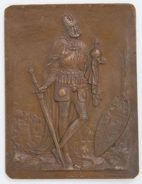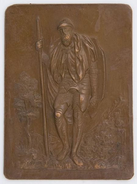 Curator: Here we have an intriguing piece, "Ariovistus, from the series 'The Twelve Oldest German Kings'," by an anonymous artist, a small bronze relief. Editor: It has a solemn, almost stoic mood. The textures—the armor, the rough ground—suggest a somber narrative. Curator: Indeed. Note how the light plays across the figure, emphasizing the lines of the armor and the resolute stance, almost a figure of defiance. Editor: And the materiality is fascinating. Bronze, with its historical associations, lends a weight and permanence to the subject. Imagine the labor involved in its production. Curator: Yes, the artistic choices elevate Ariovistus beyond mere representation, crafting a powerful image of leadership. It certainly gives the impression of command and strength. Editor: The deliberate use of bronze transforms the piece from a simple portrait into a study of historical power dynamics and the means by which such power is constructed and disseminated. Curator: A potent reminder that even in miniature, a work of art can be dense with historical and aesthetic considerations.