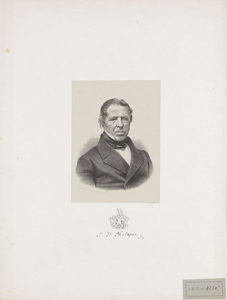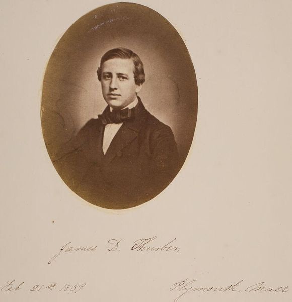 Curator: Oh, what a face! He seems caught between the weight of scholarship and maybe a secret longing for something…lighter. Editor: Indeed. We're looking at an oval studio portrait of Matthias de Vries, a professor at Leiden University, captured between 1873 and 1874 by Bernardus Bruining. It’s a gelatin silver print. Curator: A professor! I knew it. There's an academic gravity there, like he’s contemplating the weight of words and wisdom. But, there’s also a flicker—maybe a story he's not telling. That photographic oval is almost claustrophobic. Editor: The oval format does add to that sense of containment, doesn’t it? It was a very common stylistic choice for portraits in that era. It isolates the sitter, focusing our attention entirely on their face, attire and what they represent. Notice also the deliberate pose and staging to capture his intellect and standing. Curator: He looks properly…serious, right? This pose is so symbolic. Almost iconic in its formality, don't you think? But tell me more about the symbolism embedded in academic portraiture? Editor: Consider the clothing, the pose, even the subtle retouching to project not just an image of a man, but of scholarly authority, trustworthiness and virtue. His gaze meets ours, but it's a controlled, thoughtful meeting, a careful invitation to connect with his intellect rather than his personality. It says, "I represent knowledge, I represent tradition." Curator: Tradition, exactly. And sometimes tradition can feel a little heavy. I keep wondering what made him tick. He has this glimmer that makes me think of someone breaking free! Or trying to at least. Editor: Perhaps photography was still a new medium, and to sit for a portrait was a very important, and thus serious, undertaking? The lack of spontaneity or what seems like restraint can, in itself, be telling. Curator: Restraint for days! He’s got me captivated though. In the end it makes the mystery more enjoyable and relatable. Editor: Ultimately, in considering Matthias de Vries, we delve beyond surface resemblance. We begin to read how society reflected, constructed, and, literally, pictured its values. It really allows us a portal into that era.