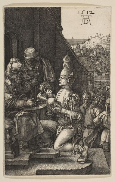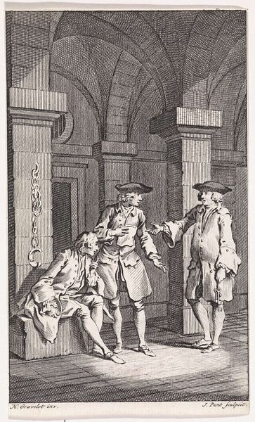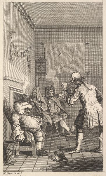 Editor: Here we have the frontispiece to Volume 1 of "Tristram Shandy," a print from 1760 by Simon Francis Ravenet the elder. The composition, chaotic yet contained, draws the eye to the disarray within the room. What is your interpretation of how form dictates meaning in this engraving? Curator: Let us begin with the lines themselves. Notice the density of hatching. The artist utilizes close, parallel lines to suggest shadow and volume, especially prominent in the figures' clothing. This detail adds depth to an otherwise flat medium, creating a tangible sense of texture. Do you see how the artist masterfully controls value to create emphasis? Editor: Absolutely! The heavy shading around the seated figure near the fireplace really pushes him forward in the composition, contrasting with the lighter figures surrounding him. But is there something more to this arrangement of the characters? Curator: Consider the tapestry. It hangs as an emblem behind the scene, a distorted heraldry of sorts. Its linear forms and fragmented imagery mirror the disruptions in the scene. Could it be a commentary on the very structure of narrative itself, as evidenced by the unconventional poses and relationships depicted? Editor: That's a fascinating point. So the artist's technical choices like line and value actually create meaning. The linear texture overall serves the emotional effect as much as the figurative accuracy of forms within the picture. Curator: Precisely. Each element is deliberately placed to guide the eye and create a holistic aesthetic experience. And note how it contrasts so sharply with a style rooted in Baroque art. Editor: So the engraving, on its surface a glimpse into a lively scene, presents a more profound argument for how visual structure affects meaning. Thank you. Curator: My pleasure. Form, as always, provides the keys to interpretation.