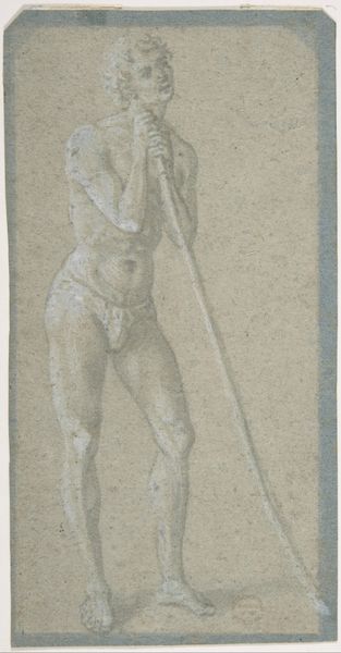 Curator: Paolo Farinati, working somewhere between 1535 and 1606, rendered this work, "A Man Resting on a Staff," with charcoal. The piece now resides here at the Metropolitan Museum of Art. Editor: It projects a certain contemplative mood. He’s sturdy but also weary. What catches my eye first is that the man's gaze is directed away, seemingly lost in thought. The staff suggests both support and perhaps the weight of something carried. Curator: The interesting element, here, for me is the deliberate archaism in Farinati's figuration. There's a consciousness of classical sculpture and a knowing deployment of it. This stance, almost theatrical, serves as a claim to legitimacy and a connection to inherited power structures of that classical past. Editor: I'm struck by the way the charcoal highlights accentuate his musculature and draped cloth, and also give an expressive, shadowed appearance to the work overall. The staff is an attribute, of course. Do you think it’s intended as a scepter, a symbol of authority, or more literally a walking stick, implying pilgrimage or journey? Curator: Probably both. Symbols don’t have single meanings, right? The staff operates as both literal support, as a humble cane, while visually invoking those associations of power and the implied stability of leadership. I wonder, though, if the ambiguity is a commentary. The staff supports him, but to what end? Editor: Yes, this really reflects Mannerism: an intentional manipulation of proportion and exaggerated anatomy. I almost wonder if there is social critique being made, and perhaps the knowing, distant gaze hints at it as well. What is the overall statement of this piece, in your opinion? Curator: In this depiction, he seems like he’s on the margins. The artist seems to be challenging norms, offering perhaps a subtly subversive image through a classical form. He isn't actively leading or dictating, but rather resting, waiting... assessing. The image leaves the specifics to the viewer. Editor: I agree entirely. I’d just add that the symbolic nature of the materials used to realize the portrait adds an essential component as well: this character has been hewn through humble materials of print, pencil, charcoal; and that he projects through time to still capture our attention in this very room.