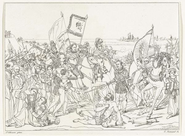 This watercolor drawing, "The Battle of ?", was made by an anonymous artist. It depicts a fierce military engagement, complete with clashing soldiers and a town in the background. The image raises several questions about the social and political context in which it was made. Who commissioned it, and for what purpose? Is it meant to glorify war or critique its brutality? The lack of specific details – the battle's name, the artist's identity – suggests a broader commentary. Perhaps it reflects a common European experience during a time of frequent conflict, like the Napoleonic Wars. The image visualizes the way a military institution functions by showing us soldiers fighting, and the chain of command in the shape of the man on horseback. By examining military archives, period newspapers, and other historical documents, we might better understand the social conditions that shaped this powerful depiction of war.