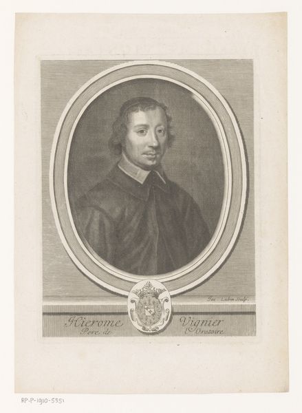 This is Jacques Lubin's portrait of Jean-François Senault, created using engraving techniques sometime in the late 17th century. Notice how the composition is structured around a series of nested oval shapes, framing Senault and his family crest. Lubin masterfully uses line and texture to articulate form and depth. Parallel lines create subtle tonal shifts, defining the contours of Senault's face and clothing. The texture of the paper itself becomes part of the visual experience, adding a tactile quality to the image. This portrait operates within a semiotic system, where visual elements function as signs of status and identity. The formal arrangement, with its emphasis on symmetry and balance, reinforces notions of order and hierarchy. However, Lubin's skillful manipulation of line and texture also introduces a degree of visual complexity, subtly destabilizing any fixed interpretation. The engraving exemplifies how formal qualities can function as part of a larger cultural discourse.
