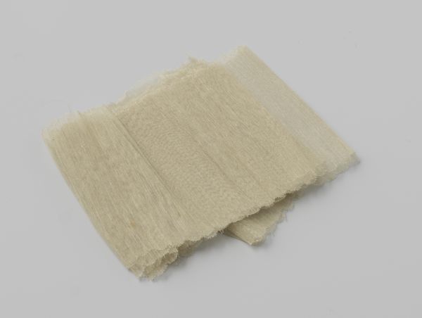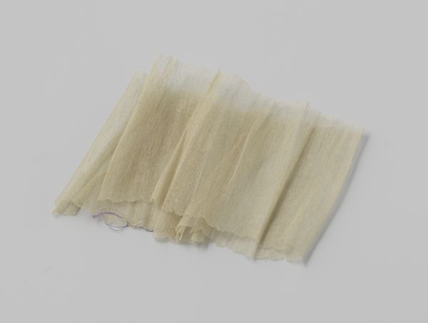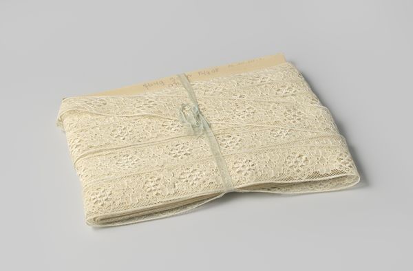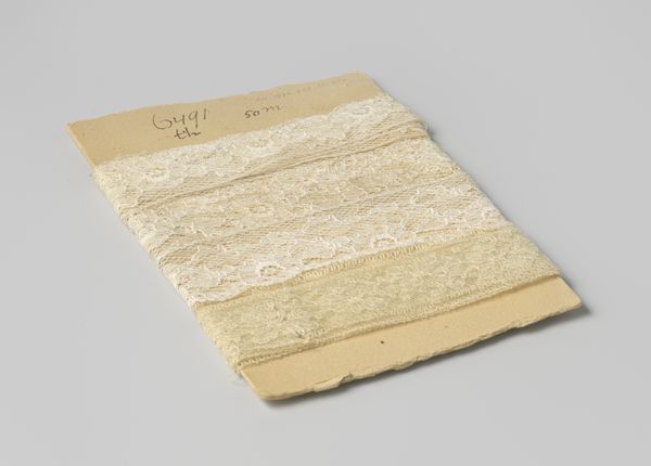 Curator: This object from around 1925, held here at the Rijksmuseum, is described as machine-made, creamy-white lace trim featuring a continuous leaf-scroll pattern, mounted on cardboard. Editor: It looks almost bridal, but with a melancholic tinge. A forgotten detail, patiently waiting for its purpose. The neat little rolls create a hypnotic rhythm... but is it sad? Curator: Considering the historical context, mass-produced lace signified democratization in fashion and textiles. The intricate patterns, once exclusive to the upper class and created through laborious handcraft, became accessible to a wider population via machines. What was once carefully crafted is now cranked out at scale, the labor outsourced to factory. Editor: Absolutely. It’s interesting that even as the means of production shifts, the *idea* of handmade elegance endures – look at the attempt to simulate hand-crafted lace, those little repeated leaf motifs are kind of cute. Does the object embody a tension, then? The embrace of technology clashing against something considered more elevated, personal…dare I say, artful? Curator: The material properties are fascinating, aren’t they? The stark juxtaposition of the delicate textile with the industrial process required for it hints at shifts in the production and the value that has been placed on textiles over the past century. It calls into question our ideas of art vs. craft too. Is mass-produced lace of value when compared to individually-crafted handmade lace of generations past? Is its purpose diminished? Editor: It's ironic how something so designed for adornment is now displayed without a dress or a cuff to grace! And yet, it holds a different kind of beauty. Almost philosophical! Perhaps the act of mechanical reproduction drained some soulfulness from it? Curator: Or perhaps, in its accessibility, it found a new soul— a communal one, interwoven into the everyday lives of many. We can appreciate this lace today as not only textile, but also an enduring monument to change. Editor: I agree; this understated roll becomes a window into evolving cultural priorities, our shifting notions of craft, and also industrial achievement. I wonder, when our own age is considered in such an historical lens, what seemingly minor technological artefacts would convey volumes?