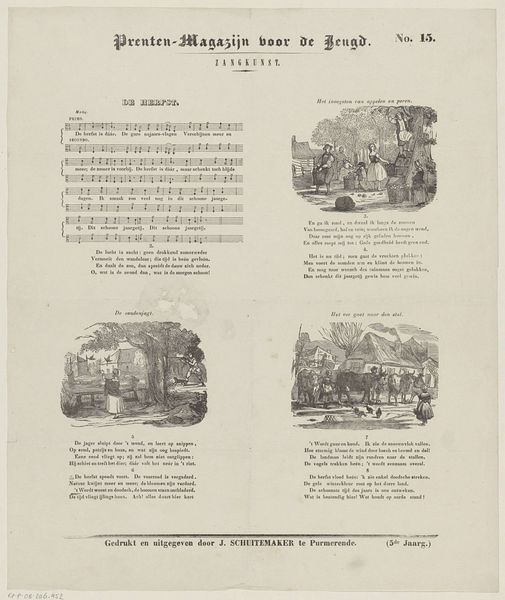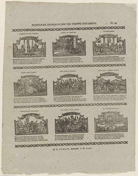 Curator: So, here we have "Kinderspelen," or "Children's Games," an engraving from 1850 by Jan Schuitemaker. It looks like a page from a children's magazine, filled with different scenes of kids playing. The style feels a bit formal, but there's a charm to seeing what pastimes entertained children long ago. What strikes you about it? Editor: I love the variety of games shown! It's like a historical snapshot of childhood. I’m curious – were these games particularly popular at the time, or do they reflect broader cultural values? Curator: I suspect they are a mix. Some, like stilt-walking, archery, and hopscotch, are timeless and universal, speaking to a child’s natural inclination toward challenge, competition, and imaginative play. Games like "Ganzenbord" – which I think means "Game of the Goose" – played indoors, probably point to domestic values and family entertainment. Look how serious everyone seems. It is as if playing the game is more important than winning. Does it trigger any memories from your own childhood? Editor: That makes a lot of sense. It’s funny, my first thought was about how simple these games seem compared to today’s video games, but seeing them in this cultural context makes me appreciate their charm more. Curator: Absolutely. And maybe there's a lesson there about finding joy in simplicity. The engraving also reflects the rise of Romanticism, that values emotionality and that finds beauty in everyday moments. These small moments add up to create an idyllic portrait. Editor: That’s a great point – the connection to Romanticism. I went in expecting something straightforward, but I leave seeing much more depth. Thank you. Curator: Likewise. It is always amazing what details reveal themselves the more you ponder a work of art.