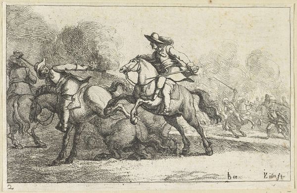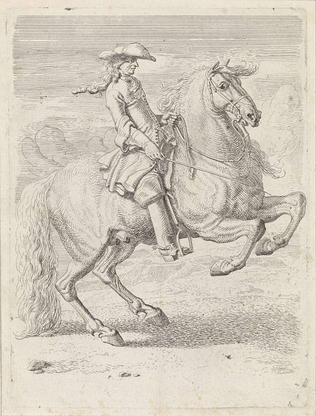 Dirk Maas created this etching, "Steigerend paard met ruiter," showing a rearing horse and rider, sometime around the late 17th to early 18th century in the Netherlands. The image reflects the cultural values of the Dutch Golden Age, when equestrian skill and military prowess were highly esteemed. Note how the rider, confidently perched atop the powerful steed, embodies authority and control. This piece subtly hints at the social hierarchies of the time, where horsemanship was often associated with the aristocracy and military elite. The print suggests not just a mastery over the animal, but also a mastery over one's position in society. It also brings up the emotional charge associated with images of power and control. Consider the perspectives of those who may have been excluded from such displays of dominance. Maas's etching invites us to reflect on the complex relationship between power, identity, and representation during a transformative period in European history.