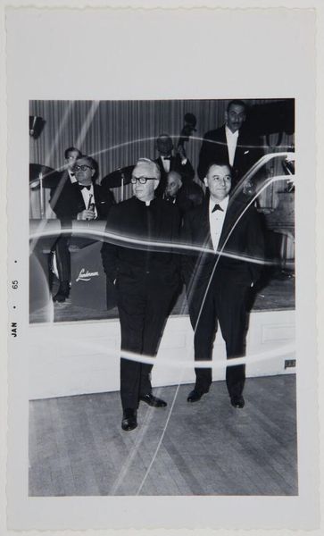 This photograph, Untitled (men in suits), of unknown date, was created by Robert Burian. Its arrangement of figures in formal attire projects an aura of staged formality. The composition is structured by stark contrasts. The high-contrast black and white emphasizes the men's suits, delineating their forms against the neutral background. We can observe how the artist captures a convergence of social codes and visual semiotics. The subjects' attire and arrangement reflect societal expectations of formal gatherings, while the composition prompts us to question what is not visible or explicitly stated. The positioning of the figures challenges our reading of space and hierarchy. The gaze of the men, combined with the tonal range, creates a complex layering of meaning. The photograph can be seen as a cultural artifact that, through its structured composition and the interplay of light and shadow, invites ongoing interpretation.