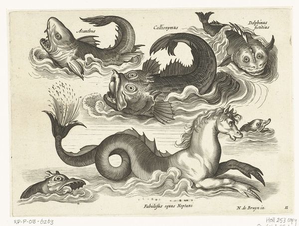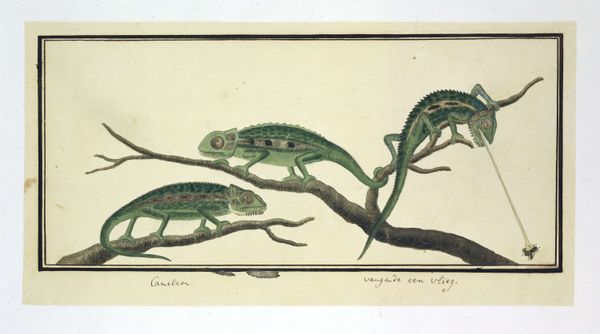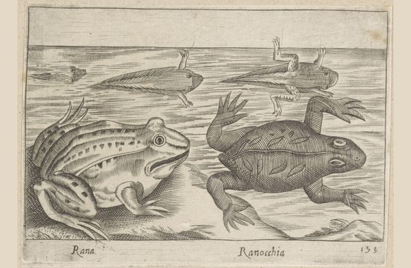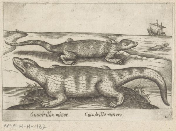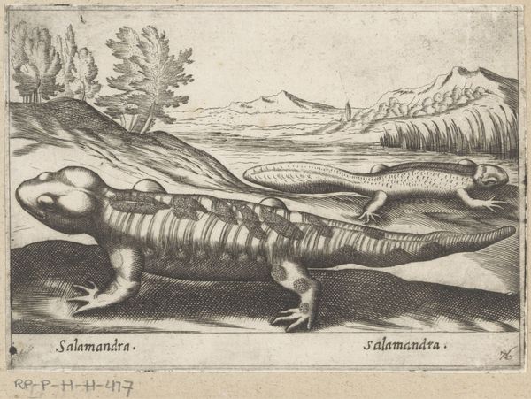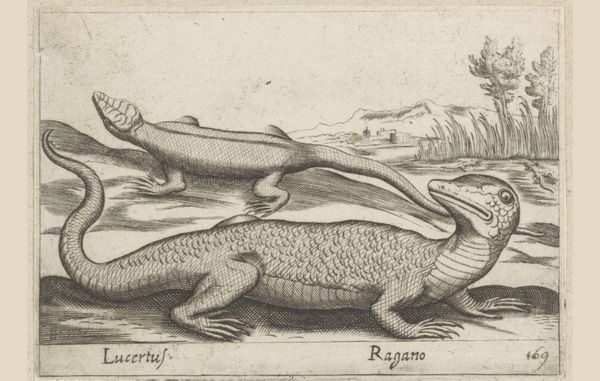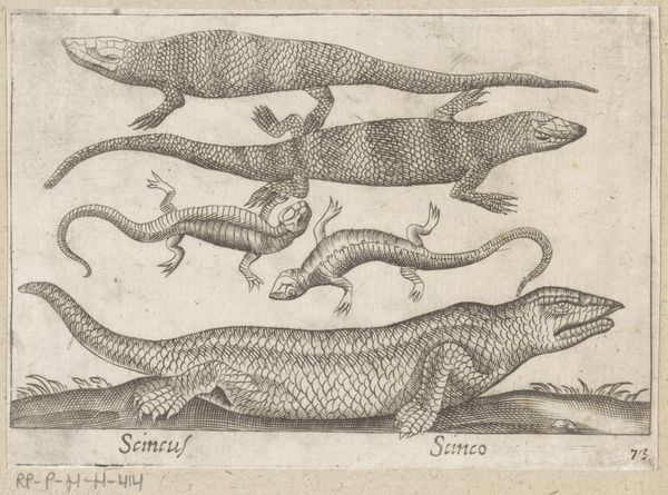 Curator: Here we have Antonio Tempesta's "Three Lizards," or "Drie Hagedissen," from before 1650, housed here at the Rijksmuseum. It's an engraving. What's your immediate take? Editor: It’s peculiar, in a captivating way. There's an odd formalism—the lizards are stacked almost like specimens, yet it still conveys movement. Are they scientific illustrations, perhaps? Curator: That's an excellent question. Tempesta's known for his battle scenes, landscapes, and animal studies. His prints, widely circulated, catered to a growing interest in the natural world but also functioned as decorative elements and sources of visual inspiration for other artists. So, function precedes absolute accuracy. Editor: Right, so this wasn't necessarily about objective documentation but about creating appealing images. Still, these reptiles are presented without any real habitat – a blank slate if you will, which turns them into objects to observe, classify. A demonstration of control, perhaps? Curator: Interesting perspective. The act of depiction itself is always tied to power dynamics. Remember, early scientific illustration played a key role in shaping European understanding—and exploitation—of the natural world and new territories. Editor: Absolutely. And the very deliberate rendering—the careful cross-hatching, the subtle tonal variations on what I assume is toned paper—highlights the artificiality of it all. Look at those claws. And consider this against the backdrop of colonization, these kinds of images played into narratives of dominance. Curator: Indeed, they were visual tools used to categorize, claim, and ultimately control. And the presence of Latin names “Lucerthila, Lucerta” reinforce a desire to classify and taxonomize. Editor: These creatures are almost theatrical in their arrangement. They occupy a liminal space, somewhere between nature and artifice. Curator: A tension inherent in the age. Now when we look at art and media, this piece reminds us that it carries historical weight and consequence. Editor: Exactly, by putting them into a contemporary framework, we may question the intent. Curator: I am now forever changed! Editor: Yes! A powerful experience, for both of us.