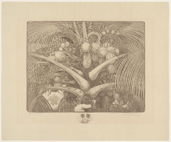 Curator: This linocut, "Bloemkool," created between 1887 and 1924 by Julie de Graag, presents us with a strikingly detailed image of a cauliflower. It's currently housed in the Rijksmuseum. Editor: Yes, it's fascinating how such detail is captured using this method! It's quite striking with its high contrast, almost austere. What strikes you most about this piece? Curator: The very choice of subject matter, a humble vegetable, immediately speaks volumes. We have to consider the social context: Who gets to depict, and therefore control, the narrative of daily life? Is it not usually the aristocracy? By choosing such an ordinary subject, de Graag implicitly democratizes art. This is especially striking for a woman artist during this time, when their roles and voices were often constrained. Editor: That’s an interesting perspective. I wouldn’t have considered the implications of something so seemingly simple. It really does highlight how art can challenge social hierarchies. The heavy contrast feels quite modern too. Curator: Indeed. And consider how the starkness can also function as a feminist critique. Are idealized and overly sexualized depictions of women replaced with a complex view of organic subject? It questions notions of beauty, challenging us to find value in the overlooked and the everyday. Editor: That’s such a thoughtful way of putting it. So much to think about when you start digging below the surface! Curator: Exactly! It’s about expanding our definition of art to encompass the realities of marginalized communities. Looking closely can transform our perspective of history itself. Editor: I see what you mean! Thank you, it's been truly illuminating. Curator: The pleasure was all mine! Hopefully, we can look at something together again soon.