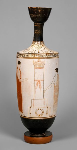 Editor: Here we have a lekythos, dating from around 450 BCE, attributed to The Carlsberg Painter. It’s made of ceramic, and seeing it here in the gallery, I'm struck by the subtlety of the figures against the white ground. The faded reddish-brown lines almost whisper a story. What do you see in this piece? Curator: I see echoes of ritual and memory. The lekythos itself, its very form, speaks to us of funerary rites. Oil vessels such as these were commonly placed in tombs as offerings to the deceased. Consider the imagery then, the figures enacting some unknown scene near what appears to be a... loom, perhaps? Editor: A loom, yes! That’s interesting. So the figures…are they weaving something significant? Curator: Maybe, or they could be adorning a funerary bier. The loom can act as a potent symbol. Are they creating a shroud? Cloth represented life in Ancient Greece. Now the lines are faded, but imagine them once bold, enacting a performance in memory of the deceased. What cultural memory do you suppose this painter tried to awaken? Editor: That’s a poignant thought – trying to capture a whole life through this scene. I never considered the loom's connection to fate. Perhaps this pot was meant to not only hold oil but to serve as a narrative itself, weaving the story of the deceased in subtle imagery for those visiting the tomb. Curator: Exactly! This is a shared cultural symbolism, a dialogue conducted in the language of images across time. I believe that seeing it this way brings us closer to understanding what the original audience may have been feeling.