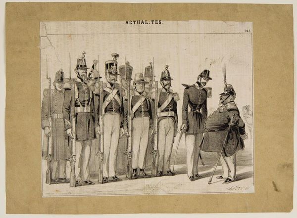 Martinus Rørbye created this etching, *Borgerskabet i Thisted*, in 1830. It’s deceptively simple, just ink on paper, but let’s consider how the artist’s technique infuses the image with meaning. Rørbye used etching, a printmaking process where lines are incised into a metal plate with acid, then inked and transferred to paper. This method allows for fine detail and subtle tonal variations, perfect for capturing the nuances of the scene. The stark black lines against the white paper create a sense of immediacy and clarity, almost like a newsprint image. But what does this medium tell us about the subject matter? Etchings were often used for reproductions and documentary purposes. By choosing this technique, Rørbye elevates a local civic guard to a subject worthy of wider attention, documenting their role in society, and inviting us to consider the labor, politics, and even the implied cost of maintaining such a force. It blurs the line between fine art and social commentary, reminding us that even the simplest materials can carry complex messages about power and community.