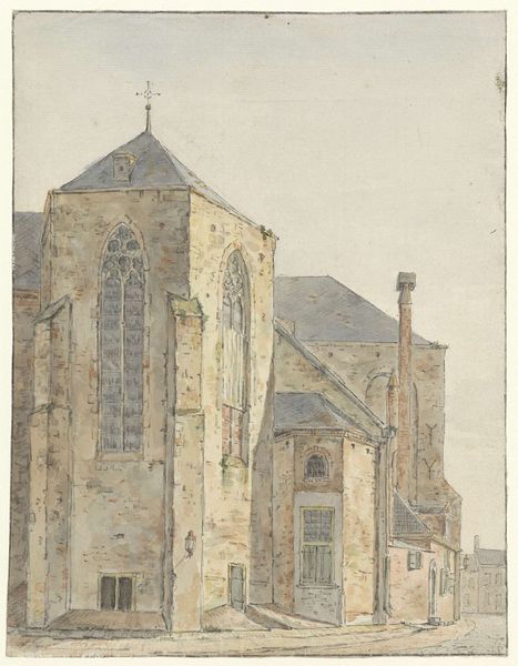 Editor: Vilhelm Hammershoi's "St. Peter’s Church, Copenhagen," painted in 1906, captures this imposing building in oil. It's quite muted, almost dreamlike, in its coloring. The composition, with the stark vertical tower against a pale sky, creates a somber, almost lonely feeling. What catches your eye about this work? Curator: The spire piercing the sky immediately draws attention. Spires are laden with symbolism. They represent aspiration, reaching towards the divine, the ultimate transcendence. In this instance, what does it mean to us? Hammershoi seems to use this symbol ironically, since there is such a deep quiet, the spire is not surrounded by glory, there is the mood of winter. Editor: Irony, interesting. I see the quiet you mentioned. The bare tree amplifies the stillness. It’s all so hushed. Curator: Indeed. Note also the repeated geometric shapes – the rectangles of the buildings, the pointed triangles of the roofs and spire. Think of the meaning embedded within these forms. The Church’s tower is essentially a pillar and its spire an obelisk. We cannot separate its message from the architectural and aesthetic principles behind its structure, but consider it from a human scale – in a sense dwarfed. What might this symbolize, in this painting and to you? Editor: Perhaps our own insignificance, maybe even humility in the face of something eternal? Also the muted colours, how would you respond to these shades in our mind’s symbolic arsenal? Curator: Precisely! Now consider the emotional and spiritual implications given the painting's title. The image creates an atmosphere heavy with a quiet and deep spiritual search. The greys and browns, drained of vitality, speak of introspection, or even a questioning of faith rather than its blind acceptance. Editor: That’s given me a lot to think about; I am finding myself re-evaluating its visual expression in muted symbolism! Thank you for illuminating Hammershoi's iconic perspective. Curator: My pleasure. Now I am wondering what meaning it has for you in this specific moment, here, now? That’s where it lives.