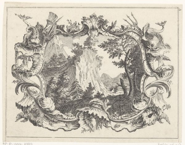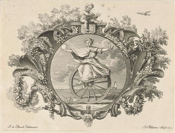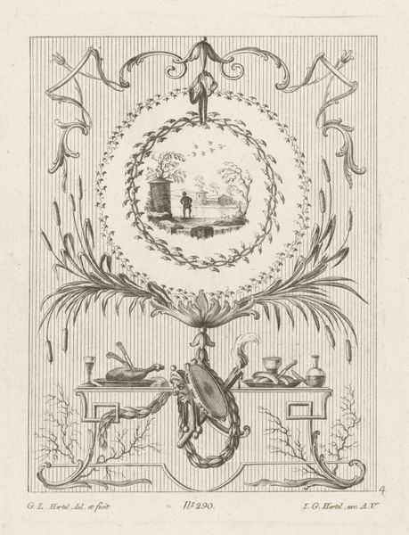Curator: So, we’re looking at "Medallion with man with scythe," an engraving made sometime between 1746 and 1775. It's unsigned, residing at the Rijksmuseum. Editor: Yes! At first glance, it appears so delicate, this ink drawing of a rural scene, framed by a garland and set against almost wallpaper-like stripes. What strikes you about this print? Curator: The production process itself. We should consider the material reality of prints in the 18th century. This wasn’t 'high art' necessarily, but a reproductive medium, enabling images and ideas to circulate widely, reaching new audiences, even adorning domestic spaces as suggested by those stripes. Editor: Interesting! So, instead of focusing on the artistic genius, you are interested in how this object worked? Curator: Precisely! Look at the precision of the line work – think about the engraver, a skilled artisan transforming an image onto a copperplate through intense labor. The availability of paper and ink mattered too; each impression represents the consumption of these materials. This image participates in a network of making, distribution, and reception that speaks volumes about 18th-century society. What about the subject matter? A man with a scythe – What do you think that conveys? Editor: It feels almost romanticized, like a celebration of rural labor...or perhaps is it actually commenting on the socio-economic disparities of the time, showing a romanticized or stylized farm? Curator: Exactly. Perhaps its the labor of reproducing images in a growing commercial market and consumption society? And what laboring means more broadly in a world of vastly different working conditions. Editor: I never thought about engravings this way before, considering the labor and materials involved, rather than just the final image! Curator: Seeing art through the lens of material conditions opens up so many avenues for understanding its significance!
