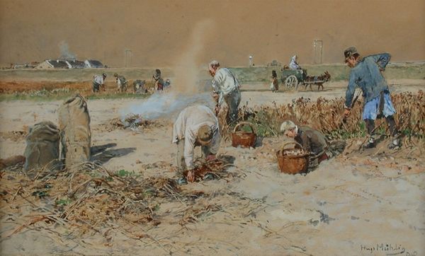 Curator: Alla Horska’s 1950 oil painting, “Harvesting,” presents a bustling rural scene. What are your initial thoughts on this work? Editor: My immediate feeling is of abundance and collectivity. The golden hues of the harvested crop radiate warmth. Curator: That resonates. Consider the socio-political backdrop. Horska created this during the height of Socialist Realism in Ukraine. Collective farms were idealized, so this imagery served a propaganda function—yet how might she be also representing a shared cultural identity rooted in rural life? Editor: Certainly, the image is replete with agrarian symbols of collective labor and the rhythm of the seasons. The loaded cart, the thresher…are those collective symbols, too, signaling unity? Curator: The people are the central focus; the group of women atop the thresher and other figures at work imply collective power. This emphasis aligned with Socialist Realism but perhaps offered Horska a space to reflect local identities and working-class solidarity. It seems like she is also trying to demonstrate a certain feminist identity given the central roles of the women presented here. Editor: Indeed. Notice how the golden hay appears almost as if its giving birth to more golden hay on the ground—abundance in spades, but there may also be religious allegories here, as hay is often perceived in agricultural regions to represent the "golden years". Curator: A keen insight. But considering that there is not the typical Soviet grandiosity, the everyday-ness of this scene, could suggest Horska quietly emphasized shared labour and local community identity and strength over imposed Soviet Ideals. There also may be an allegorical depiction of "Mother Earth" providing a fruitful outcome. Editor: I think so, especially if we also see the symbolism within the bovine presence, a consistent presence within Ukrainian folk lore of being guardians and protectors of their homeland, and people. The symbols speak powerfully to a cultural inheritance separate from political agenda. Curator: Looking at the material realities, and these images that were historically designed to influence politics, our dialogue reveals the possibility of reading social and feminist narratives within socialist impositions and the power of a symbol to carry both personal and collective meaning. Editor: Absolutely. It is quite remarkable how such simple components like the colour palettes, use of the landscape, the thresher itself, a bovine all culminate into so much, leaving a truly meaningful impression.