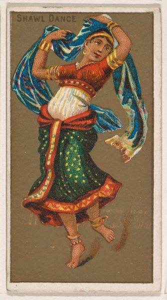 Editor: This is "Executioner, Poland, 14th Century," a print from 1888 by the Kinney Tobacco Company. It looks like a playing card or an advertisement. The figure is dressed entirely in red, holding a very large sword. What do you see in this piece beyond the immediately obvious? Curator: The immediate visual is indeed striking, isn't it? But let’s consider this image as a cultural artifact produced at a particular historical moment. These tobacco cards often exoticized and sensationalized historical figures and events. How does this image, likely aimed at a male audience, participate in the construction of Polish identity, or more broadly, ideas about power and violence? What might the red symbolize within this context? Editor: I guess I hadn't thought about it that way. I was mostly focused on the almost cartoonish depiction of the executioner, but you’re right, the color red is really intense, especially paired with his occupation. The title is also interesting... executioners were often marginalized individuals themselves, outcasts. Curator: Exactly. And by placing this figure within the specific context of 14th-century Poland, it evokes a whole history of conquest, resistance, and shifting power dynamics. Consider how the act of marketing tobacco relies on certain power dynamics, even oppressions in global relations, connecting to colonial histories. The choice to depict *this* figure speaks volumes, doesn’t it? How might this image also reflect anxieties or fantasies surrounding masculinity and control prevalent in the late 19th century? Editor: That gives me a lot to think about, I’d originally dismissed it as a trivial commercial object, but seeing it in terms of its cultural context and how it speaks to broader historical power struggles really changes everything. Curator: Absolutely. By analyzing such imagery, even something seemingly innocuous, we start to unpack the complex ways in which power, identity, and history are visualized and consumed.