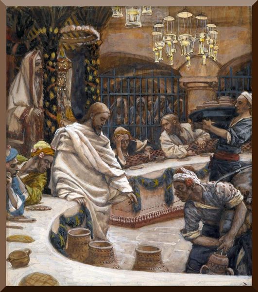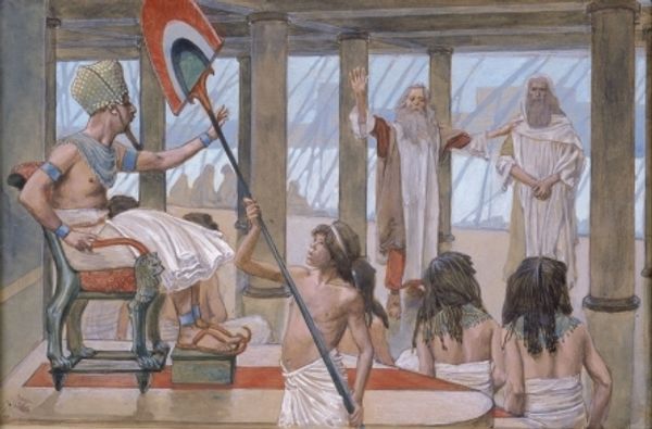 Curator: Let’s consider James Tissot's painting, “The Plague of Flies,” created in 1902 using gouache. Editor: My first impression? The oppressive atmosphere is immediately apparent. The frantic gestures of the figures, combined with the dense swarm of flies, create a visually chaotic scene. The pallid colors amplify the overall sense of discomfort and dread. Curator: Indeed. This work depicts one of the plagues visited upon Egypt in the Book of Exodus. Tissot's art often grapples with historical and religious narratives, framing them in a way that reflects the power dynamics between those who wield authority and those who suffer its consequences. Look at Pharaoh; visibly distressed and isolated despite his power. Editor: I see what you mean. Pharaoh’s posture is key. But also consider how Tissot organizes the pictorial space – the central, vertical orientation with the columns visually compressing the figures into a relatively shallow picture plane heightens that sense of confinement and suffocation. The composition supports the subject. Curator: Absolutely, the claustrophobia isn’t merely thematic but structural. I see it too in the visual weight of the unyielding blue columns bearing down on the people and contrasting sharply with the muted browns and beiges of their skin. He seems to be deliberately underlining the imbalance of privilege. Editor: While your analysis of subject matter and historical underpinnings offers great context, I’m particularly struck by the execution here, specifically by Tissot's command of his medium. The delicate strokes of the gouache to define details while suggesting form allow for the illusion of depth but in this almost ethereal way... a plague that has materialized and permeated this otherwise decorative, architectural interior. Curator: And thinking about our own plague times…how relevant these kinds of power struggles seem across centuries. Consider the layers of interpretation within contemporary socio-political dialogues – about governance, the relationship between religious narratives and historical events. It allows us to consider how plagues expose existing inequalities. Editor: Well, seeing it framed in that context deepens its resonances for me, absolutely. Even if the immediate experience of this painting stems from its successful formal qualities, the impact is undeniable.