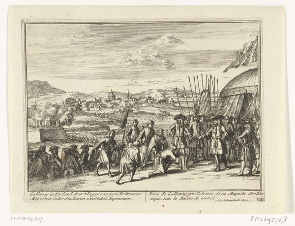 Editor: This engraving, "Departure of the Spanish Garrison from Hulst, 1645" by Pieter Nolpe, captures a really specific historical moment. It’s almost panoramic in its scope. I find myself wondering what daily life would have been for people during this particular conflict and how an event like this affected the culture. How would you interpret this work? Curator: Given its time, this engraving plays a significant public role. Remember that prints like this circulated widely, shaping public opinion about the Dutch Revolt and the Eighty Years' War. Nolpe presents the Spanish leaving Hulst, a Dutch victory, as orderly, but doesn’t that also imply the conflict continues? Do you think that changes our understanding of how history is perceived? Editor: Definitely. Presenting it as orderly almost normalizes the political instability. It seems more about conveying control, or even making the conflict seem commonplace for public consumption. It is not necessarily propagandistic, it normalizes displacement and militarized landscape. Curator: Precisely! Think about the context: the war shaped Dutch identity. How were victories and defeats presented to solidify a national narrative? Were prints such as these ever questioned or challenged at the time? What alternative forms of information were out there for people? Editor: So, this wasn't just art; it was a form of news, carefully curated for public consumption. I see it more clearly now as a statement about power, more than just an account of this particular withdrawal. I hadn't considered how accessible such images could be to the masses. Curator: And with accessibility comes responsibility and consequences, for both the artist and those in positions of power. I’m left thinking about the effect on Dutch national identity. What have you discovered through this? Editor: I now understand that art and history painting can be intertwined with nation-building. And I understand the ways public mood can affect production of artistic and historical renderings. Thanks so much.