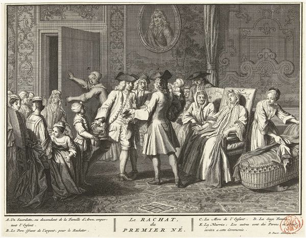 Editor: This is a print entitled "Bijeenkomst van het broederschap St. Lukas te Dordrecht" created in 1736 by Aert Schouman, and it's currently held at the Rijksmuseum. It feels very posed, very staged. What compositional elements stand out to you? Curator: Note how Schouman uses the ornate frame to create a pictorial space. The frame both contains and comments upon the scene. Observe the subtle gradations of line in the engraving, defining forms and suggesting depth, how do these graphic structures direct your eye? Editor: I see how the darker lines around the table really draw my eye there. Are those variations intentional? Curator: Precisely. The arrangement of figures creates visual interest; note the formal setting and how the interior space itself, with the paintings within the painting, contributes to the work's structural complexity. Have you considered the dog? Editor: The dog? It seems so…random? Out of place somehow? Curator: Random perhaps, but also structural. Observe the curve of its body mirroring elements in the overhanging frame, acting as a counterpoint to the rigid geometry of the table and figures. Do you appreciate the dialogue between these contrasting forms? Editor: I do see the curve you are talking about! I would not have noticed it otherwise! It brings this visual world together. Thank you! Curator: Yes, by attending closely to the graphic space of the composition and its inherent relationships, the artist orchestrates a harmony of visual elements that resonate. What will you remember most from our short conversation? Editor: I think how formalist approaches change one's observation habits by seeking intentionality and impact through line, shape, and pictorial arrangement. It will push me to examine artworks more methodically.