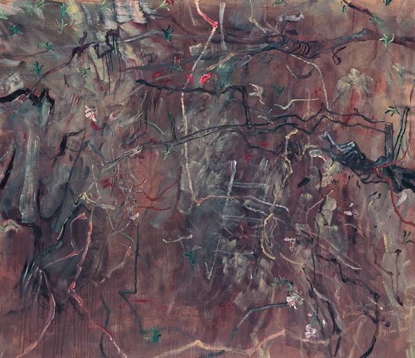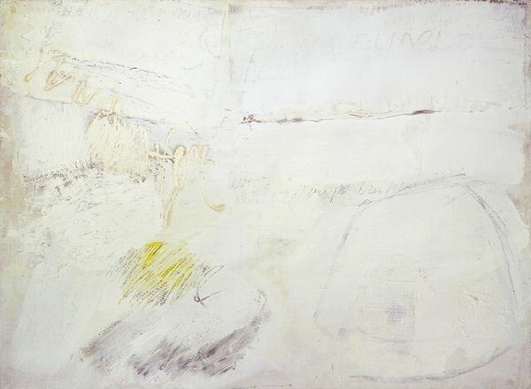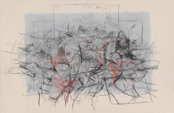 Curator: This piece is an untitled work by Cy Twombly, painted in 1957 using oil. The gestural marks almost obscure what appears to be an underpainting, creating a sense of depth and history. Editor: Immediately, it strikes me as very raw. The palette is muted, and the chaotic lines almost feel frantic, barely contained within the picture plane. I'm drawn to the texture, I wonder what type of paint Twombly has employed. Curator: Twombly often invokes a kind of cultural memory in his apparent chaos. Think of classical graffiti, palimpsests of meaning hinted at, partially erased, or just overlaid in a stream of consciousness. Editor: Absolutely. The layered effect suggests process and revision. Is that visible ground layer the underpainting? The surface looks heavily worked. I'm curious about the physicality of the paint application. Curator: There’s a kind of universal scribbling – the urge to leave a mark. Consider how, across different cultures and time periods, line can represent thought, absence, even presence or energy. These "scribbles," in a way, connect us. Editor: But doesn't it also reflect its specific postwar moment, where traditional skills were being abandoned? Here, craft appears intentionally negated. You can almost see the quickness of its making through its very form. It also reminds me of a deconstructed sculpture of some sort that you can just barely see. Curator: Interesting that you see a negated skill, because there’s a skill involved to make something *appear* unskilled. I perceive a dialogue with those traditional approaches you mentioned, but one filtered through mid-century anxieties and the burgeoning possibilities of abstract expressionism. I'd argue those red accents in the corner really provide visual harmony with the otherwise muted palette. Editor: Harmony maybe, or visual rupture? It seems the surface shows oil applied, wiped away, reapplied and smeared with fingers – the materiality itself expresses an intense push-and-pull in a particular cultural moment. Curator: Ultimately, this work reminds us that even perceived abstraction always carries encoded traces of experience. It begs you to slow down, see those traces. Editor: I agree. Peeling back the material layers is essential for teasing out how this piece interacts with and questions ideas about craft and skill. It shows you the physicality behind its creation.