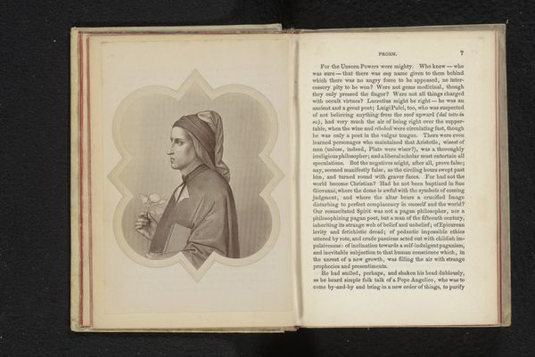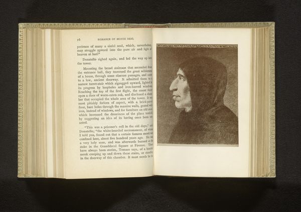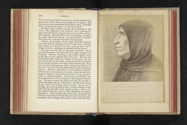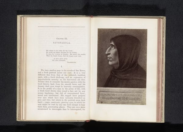 Editor: This is a photographic reproduction of a portrait of Girolamo Savonarola, made before 1888 by Edizione Brogi. It’s a print displayed in an open book at the Rijksmuseum. I'm immediately struck by the austere mood it evokes; Savonarola’s profile seems almost chiseled from stone. What visual cues strike you, looking at this? Curator: Savonarola! What resonates for me is how this image participates in the broader cultural memory of him. Even centuries later, the hooded figure, the stern profile…these are symbols of religious authority and moral rigor. It carries significant cultural weight. Editor: I can see that. It's like the visual shorthand of someone who stood against the grain. Curator: Precisely. Note how the artist highlights the severe lines of his face. Think of it less as an attempt at pure likeness, and more as a symbolic representation of unwavering conviction. His aquiline nose, in profile, it pierces, and perhaps reveals more than it hides. Consider the way this image echoes earlier depictions of prophets and reformers throughout art history. Is this an appeal to a sense of historical continuity and inevitability? Editor: I hadn't thought about that connection, the echoing of other historical figures. It certainly adds a layer of depth. Almost like placing him within a lineage of dissent. Curator: Yes! The choice to render this as a print within a book adds to that historical context. What is the role of his imagery over time? From fiery preacher to printed portrait... what continues? What changes? Editor: It makes you think about how images evolve, their meaning shifting through different eras and media. I never really considered how much cultural baggage a simple portrait can carry. Curator: Indeed! Symbols carry echoes. Looking closely helps us listen.