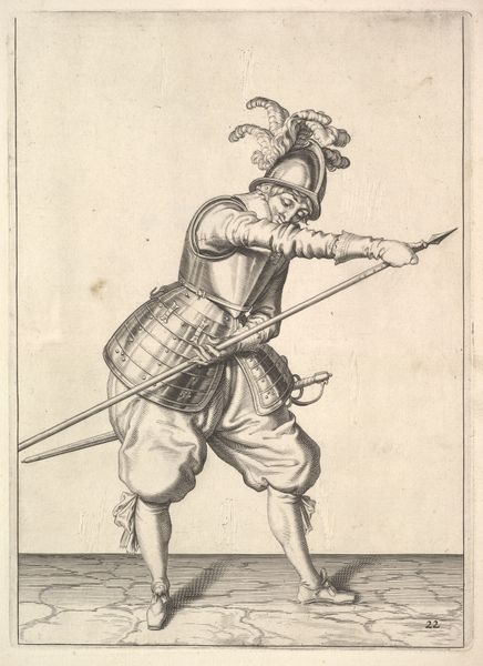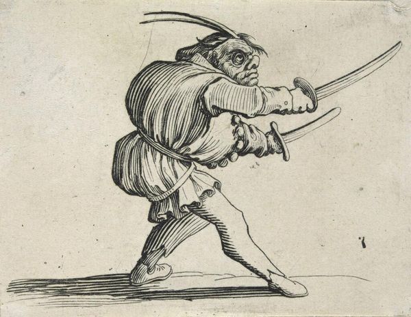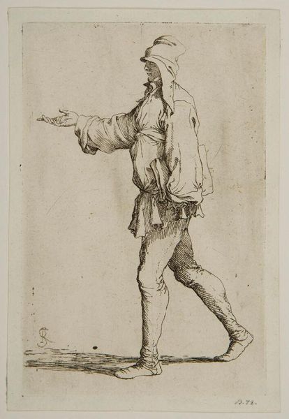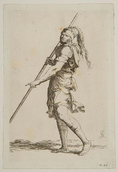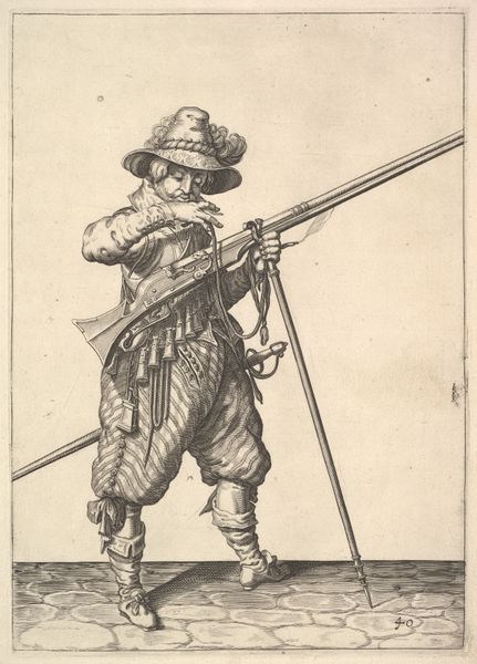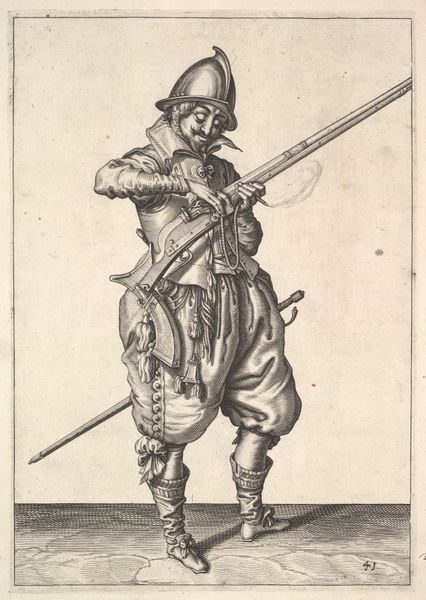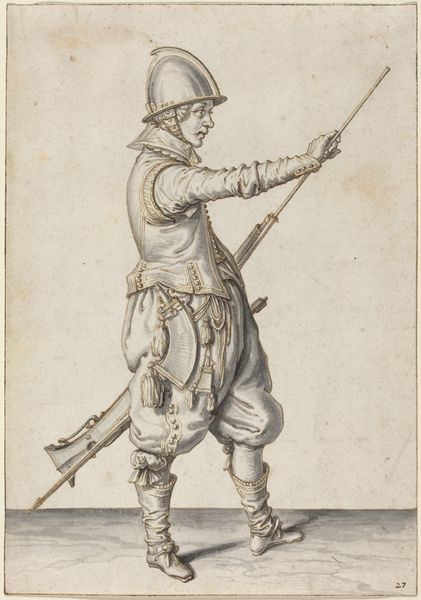 Curator: Isn't it interesting? This piece, created between 1708 and 1717 by Dirk Maas, is called "Standing Soldier, Firing His Gun". It's currently part of the Rijksmuseum collection. And it's a drawing, executed with a delicate pen technique. Editor: My first impression? Energetic, almost theatrical. The pose is so deliberate. It reminds me of those figurines that seem suspended in time and motion. Curator: Absolutely. He's all swagger and tension, isn’t he? This era, though… you feel a strong Baroque influence. It's there in the almost theatrical flourish of his stance, his clothes. Baroque loved capturing a moment of action, a peak of drama. It seethes a specific memory in our mind, isn’t it? The memory of conflicts, bravery… death. Editor: That's what catches my eye. All that detail in the clothing. Each button, crease, fold – it makes him more than just a soldier, don’t you think? More a man, caught in a specific moment of time. It seems symbolic; he's defending more than just territory. Curator: I see the cultural and historical nuances. Those details do anchor him to a time. And this connects to something primal within us all. Symbols, posture, dress all tell a complex story. Editor: You said it well. The way he anticipates and faces danger tells us of strength but also perhaps of impending doom. His posture seems so brave, his costume looks to carry years of tales… tales of blood, and fire, all in delicate pen strokes! Curator: Right, right… all of humanity’s internal conflicts expressed through the image of the poised-to-shoot marksman. Thanks to symbols this drawing communicates more than meets the eye at first sight. It stirs my feelings of respect for Maas who encapsulated it into a drawing. Editor: Exactly! It started off simple and figurative but your view now lets me read it like the beginning of some epic narrative. So simple yet so grand at the same time… almost Baroque, ha! Curator: Well, in the end it’s about feelings, memories… human stories rendered in paper and pen. Maas took what he had, his drawing style and Baroque aesthetics to create a complex cultural symbol of what it means to be ready. Editor: Precisely. An artist creates and lets other minds read them from then on. Wonderful piece and artist for sure.