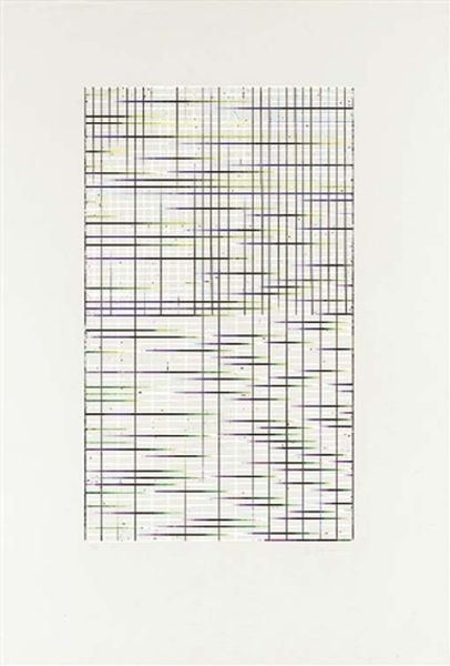 Curator: This is Jean-Pierre Raynaud's "Premiere étude pour Noirlac" created in 1975. It appears to be a study, perhaps in serial art or even minimalist abstraction. Editor: It's incredibly stark. The bold, black lines against the white background give me an immediate sense of rigidity, almost like a blueprint devoid of any warmth. Curator: Right, rigidity is key here. Consider how this seemingly simple pattern engages with serial production and the deliberate removal of expressive gesture, echoing the factory line's influence on art production itself. What kind of materials might have been used to create such precision in repeated imagery? Editor: It makes you think about control and precision in a world of constant change. It must've taken careful craftsmanship and skilled labor to produce the image. However, why the Noirlac reference in the title? Is there something to be gleaned from situating it in a specific place? Curator: Precisely. Noirlac Abbey, a former Cistercian monastery, becomes a vital component of the artistic process here. This piece could be considered in relation to architectural plans or perhaps the use of tile and design for such a structured religious structure. Also, thinking about art consumption here, the grid form allows for easy distribution of the work, echoing modularity. Editor: That resonates deeply. The historical weight of the abbey and its ordered monastic life juxtaposes sharply with the cold aesthetic of minimalism. Is it meant to critique those rigid structures, or somehow idealize their functionality and organization for art? What was Raynaud trying to say about institutions or ways of life with the cold austerity of geometric construction? Curator: Perhaps both? It questions traditional art values by focusing on process over pure visual enjoyment. At the same time, he is perhaps prompting reflection on how history and places imprint upon abstract, material forms. Editor: It does force a confrontation between the conceptual and the lived, the historical and the manufactured. There's an intellectual challenge here that moves beyond just aesthetic appeal. Curator: Agreed. There is more beneath its rigid surface than initially meets the eye. Editor: Absolutely, this initial stark impression prompts richer thinking about systems, structures, and our relationship with places steeped in history.