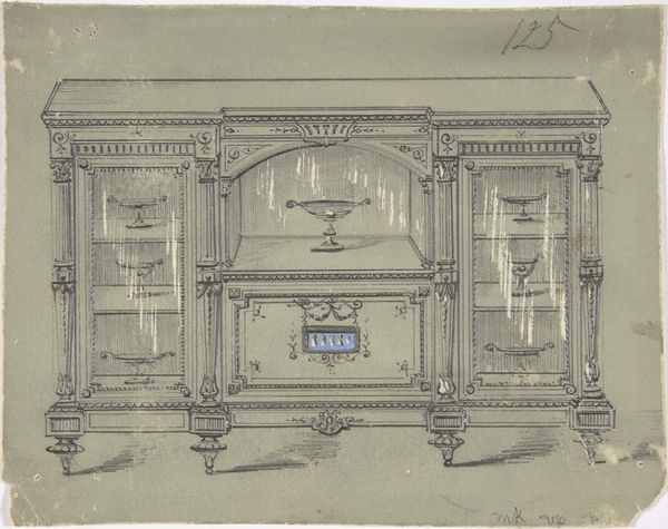 Editor: This drawing, "Cabinet Design with Glass Center Door," from between 1800 and 1900, looks like a pencil sketch on toned paper. It feels preliminary, like a peek into the design process. What strikes you when you look at it? Curator: It evokes the tension between aspiration and access that defined the decorative arts in that era. Consider who would have commissioned and owned such a cabinet. What does the design say about their identity, their social aspirations? It presents a very gendered vision of domesticity. Does it exclude certain groups and reinforce specific roles? Editor: So, you're saying the drawing reveals something about social hierarchies? Curator: Absolutely. Notice the cabinet’s proposed placement of glassware, likely expensive. This wasn't just about storage; it was about display. Think about the labor involved in acquiring and maintaining such status symbols, whose labor was it? These designs subtly reflect the inequalities inherent in that society. Editor: That's a perspective I hadn't considered. It seemed like a simple design sketch, but it really speaks to broader cultural themes. I’ll have to consider art as social commentary. Curator: Precisely. Even a seemingly innocent design choice can reflect the power dynamics of its time. By engaging in that critical lens, it brings an added appreciation to it. Editor: This makes me consider how consumerism, even today, impacts society. Thanks so much for your perspective. Curator: My pleasure. Thinking of art this way encourages engagement with difficult but necessary conversations, I’m glad to share the journey.