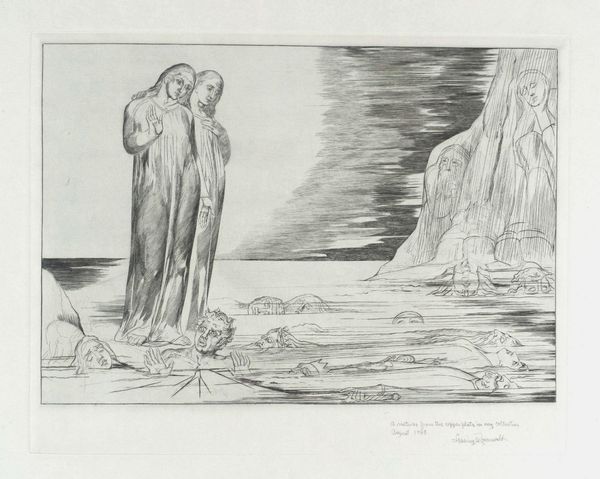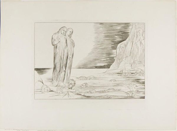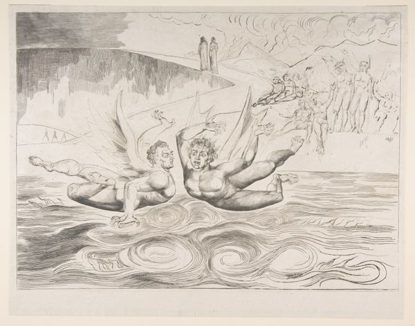 Curator: Looking at William Blake’s drawing from between 1820 and 1832, titled *The Circle of Traitors: Dante's Foot Striking Bocca degli Abbate,* it's hard not to get swept up in the social and political currents of the time. Blake, an engraver, drew from Dante's *Inferno*. Editor: Immediately, what strikes me is this incredibly desolate scene—dread practically emanates from this drawing. The sheer number of faces emerging from the ice. Eek! Curator: Indeed, the work depicts Dante and Virgil in Cocytus, the frozen lake in the ninth circle of Hell, reserved for betrayers. Blake used ink and graphite to capture the horror and psychological depth of Dante’s vision. The composition emphasizes the power structures at play, revealing how traitors threaten social harmony. Editor: Those lines are almost shivering. They conjure this bleak, eternal landscape of frozen despair, and, oh god, that one traitor whose face Dante is about to obliterate with his foot—poor soul... kinda. Curator: Blake was very critical of authority figures in society, and often aligned himself with the marginalized. Notice Dante's pose—a reflection of judgement? Consider this: Dante himself condemned Florence’s traitors within his *Divine Comedy*, providing some emotional, social and historical clues of Blake's intentions here. Editor: You can almost hear the ice cracking under Dante’s feet! I like how Blake makes us squirm. Even though the lines are simple, and the tones muted, the emotional intensity is palpable, like some sort of nightmare we all share a tiny sliver of. Curator: Through *The Circle of Traitors*, Blake pushes us to reflect on themes of political treachery, justice, and damnation. Editor: Agreed. And isn't it something how a few skillfully placed lines can freeze our very souls? Art—the ultimate power move!