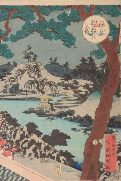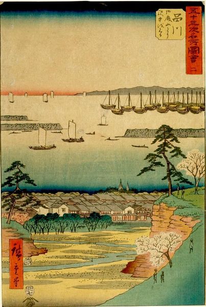 Curator: Hiroshige's "Hamamatsu," part of his Tokaido series, captures a scene along the coastal road with a group gathered near gnarled pine trees. There's a quiet, observant quality to it. Editor: It's so dreamlike, isn't it? The muted colours, the way the pine branches reach out...almost like they're trying to touch something just beyond our reach. Curator: The pine, especially these old, windswept ones, can represent longevity and resilience, key virtues along this long pilgrimage route. Editor: Oh, I love that! It's as if the trees themselves have witnessed countless journeys, holding the stories of travelers within their rings. You almost feel compelled to respect the land! Curator: Absolutely. The scene is serene, but also suggests a deep connection to nature and the passage of time. Editor: The sky feels like the end of a fairytale! It really makes you wonder what tales and memories are held within a landscape such as this.