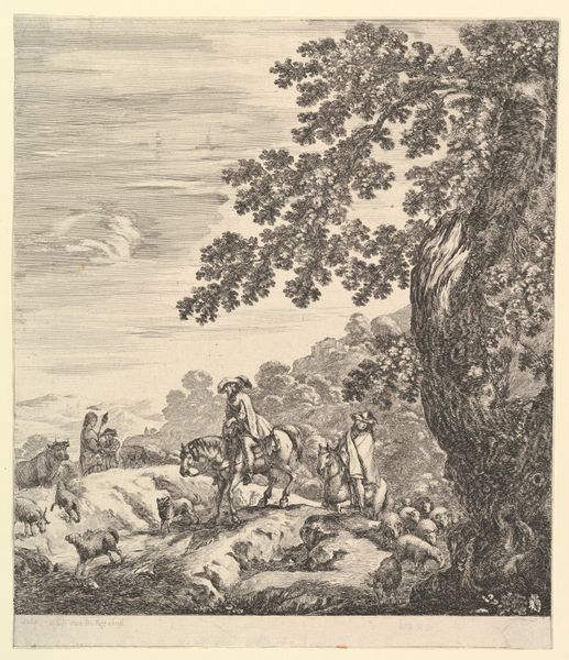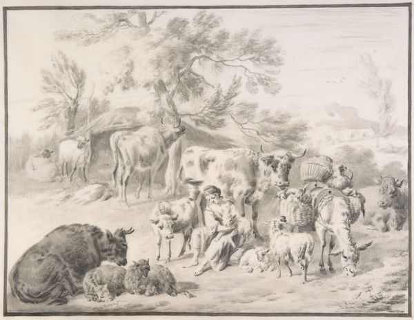 Nicolaes Berchem created this drawing of herdsmen and livestock on paper with graphite and grey wash. Washes like this one involve diluting pigment to create a translucent layer of color that is applied with a brush. Berchem's skilled application of the wash is evident in the subtle gradations of tone, which give the drawing depth and volume. Through his mastery of this technique, Berchem elevates what might have been a simple pastoral scene into a sophisticated artistic statement. Beyond its technical aspects, this drawing is also interesting from a social perspective. Berchem made numerous paintings of rural life in Italy, yet he never actually travelled there. Instead, he drew on the work of other Dutch Golden Age artists who had made the journey south. His landscapes were popular amongst the wealthy merchant class in Amsterdam, suggesting that this drawing, which appears to celebrate the peasant way of life, was intended for a very different audience.