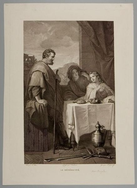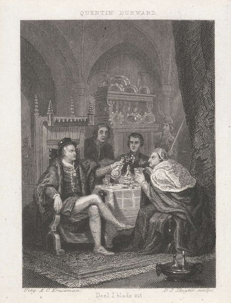 Curator: This is Thomas Goff Lupton's "Melancthon's first misgivings of the church of Rome." I see in it a story steeped in the anxieties of faith. Editor: My first thought is, wow, someone's had a heavy lunch! Look at that table—the abundance speaks volumes about the Church's wealth, juxtaposed with Melancthon's weary slump. Curator: Precisely! Lupton captures a pivotal moment. Melancthon, caught between spiritual conviction and earthly indulgence, embodies the inner turmoil of the Reformation. Editor: And the material contrast is key. The weighty rosary beads, the overflowing table, even the texture of the monk's robes—it all screams opulence and hints at the labor needed to create it. Curator: I love how the artist uses light and shadow to amplify Melancthon’s introspection, almost as if the very walls are whispering doubts. Editor: Indeed. It's a smart commentary on the Church's excess and a poignant reflection on the human cost of ideological shifts. Makes you wonder what he ate. Curator: Makes you wonder. Well, I, for one, feel I understand this historical figure a bit better now. Editor: As do I; Lupton’s print provides so much food for thought.