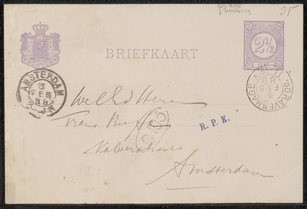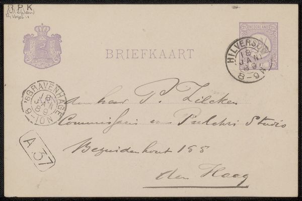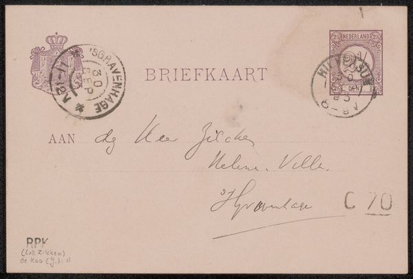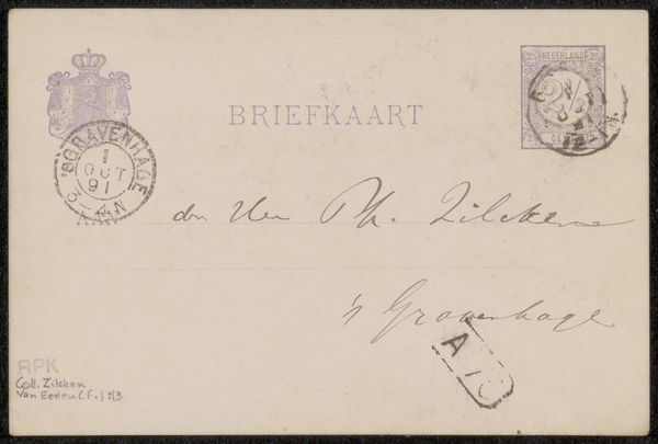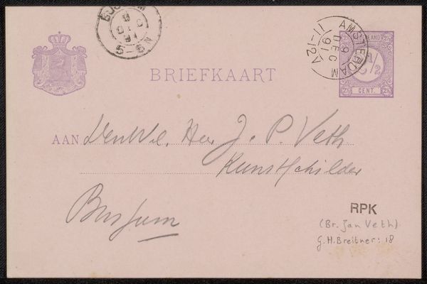 This "Briefkaart aan Philip Zilcken" was produced by Eduard Karsen at an unknown date. The visual experience here is one of faded formality. The structure of the postcard is divided into distinct zones, with the address elegantly penned in a calligraphic script. The stamps, placed at the upper corners, act as visual anchors, grounding the ephemeral nature of the message. The composition adheres to a structuralist approach, revealing a semiotic system of signs. The handwritten text, with its loops and flourishes, acts as a personal mark, contrasting with the printed, standardized elements of the card. This interplay destabilizes the conventional notion of communication, hinting at a deeper, perhaps coded, exchange. Ultimately, the muted tones and careful arrangement underscore the transient yet enduring quality of human correspondence. The postcard functions not merely as a means of communication, but as a cultural artifact, prompting a re-evaluation of our relationship with time, memory, and representation.
