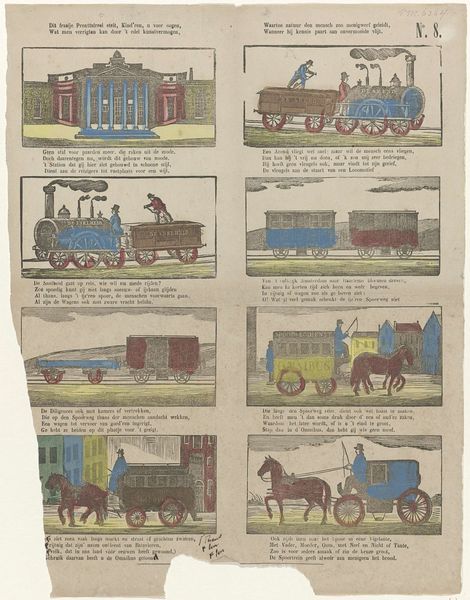 Editor: This is quite a unique piece! Titled "Dit fraaije prenttafreel stelt, kind'ren, u voor oogen, / Wat men verrigten kan door 't edel kunstvermogen, / Waartoe natuur den mensch zoo menigwerf geleidt, / Wanneer hij kennis paart aan onvermoeide vlijt" created sometime between 1856 and 1858 by P.C.L. van Staden & Co. The medium is lithograph and it currently resides at the Rijksmuseum. I am struck by the arrangement of images and text, almost like a comic book of its time, illustrating technological progress. It seems to have a narrative flow; what stories do you think it tells? Curator: Ah, yes, I find it deeply resonant; like whispers from a time of grand transformation. It's a celebration, isn't it? A whimsical testament to human ingenuity – "noble artistic power" and "untiring diligence," as the text proclaims. But consider the era… This explosion of industry also brought with it profound societal shifts. Do you see any hint of that tension within this seemingly celebratory print? Perhaps in the crowded cityscapes, or the contrast between horse-drawn carriages and the emerging railway? Editor: I hadn't thought about the tension. It feels quite optimistic, almost naïve now, with its direct comparison of progress through time in individual blocks. Curator: Naivete can be a lens too. Remember the Romantics looked to nature and simplicity *because* of this kind of industrial upheaval. Each small vignette becomes a testament to an ever brighter tomorrow! The history is being told, quite literally, through images. Isn't it curious how certain things never really change? Editor: Absolutely. It’s fascinating to consider the dualities at play—celebration versus anxiety, simplicity versus complexity. Curator: Indeed. It speaks volumes, doesn't it? About where we’ve been, and, perhaps, a little bit about where we’re headed.