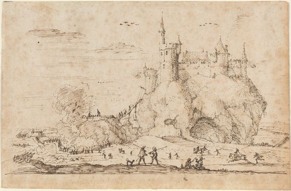 Curator: Editor: Here we have Melchior Lorck’s "Landscape with a Town" from 1549, a drawing rendered in ink, watercolour and possibly coffee, on toned paper. It feels almost dreamlike with its ethereal lines. How do you see this piece? Curator: It's interesting to consider this work through a material lens. Lorck's choice of ink and watercolour, combined with the paper itself, speaks to a specific economy of artistic production. In 1549, these materials would have had distinct costs and accessibility, directly influencing Lorck's process. Editor: That’s a great point. I hadn't thought about it in terms of cost and accessibility before. Do you think that shaped his artistic decisions, in contrast to, say, oils or fresco? Curator: Absolutely. The labour involved in acquiring and preparing these materials also plays a significant role. Where did Lorck source his materials? Who assisted in their preparation? Understanding these aspects provides insight into the social context of art-making in the 16th century and how artistic decisions were dictated by constraints that may be invisible to us today. The materiality connects directly to the social and economic realities. Notice, too, how the tonal qualities achieve specific effects within these constraints. How do the limitations of this piece also become it's strength? Editor: I guess that limited range emphasizes the detail... and knowing all this actually makes me see the skill involved even more. Thanks for showing me this side of things. Curator: Of course! Examining the materials transforms our understanding of the artwork and illuminates the conditions under which it was made.