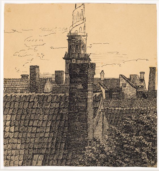 Editor: We’re looking at "Huizen bij de Onze-Lieve-Vrouwetoren in Amersfoort," a cityscape etching made with pen and ink on paper in 1896 by Wijnand Otto Jan Nieuwenkamp. The detail is astonishing. What's your take on the composition? Curator: The meticulousness is striking. Note the tower's dominating vertical thrust contrasted by the horizontal spread of the clustered buildings. How do you think the artist's choice of perspective shapes our perception of the town? Editor: I think the eye level perspective is intriguing as it gives a street-view feel; almost intimate despite the looming tower. There's an almost sketch-like, incomplete appearance due to the amount of open space between the top of the buildings and top edge of the image. What impact do you think the contrast between open space and highly-detailed, repetitive elements—windows, bricks, leaves—have on the work overall? Curator: The interplay of density and openness invites a semiotic analysis. The rigid geometry of the tower, the organic forms in the foreground, the empty space: they serve as distinct signifiers, structuring the visual field and directing the viewer's gaze. But why these components, precisely, arranged in this configuration? Editor: That’s a good point. It appears that, at the top of the scene, an erasure or removal occurred horizontally across the page; does that potentially change or alter your opinion? Curator: An alteration, perhaps, but not a detriment. These kinds of changes show intention; the formal elements themselves take center stage; each form resonates within a structural system. The cityscape becomes an exploration of form itself. Editor: That's given me a fresh perspective. Curator: Indeed; sometimes we see the city by focusing on the tower, and sometimes on the stones and earth on which the tower has its foundation.