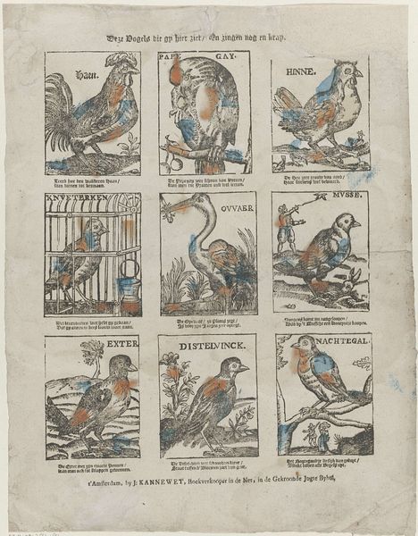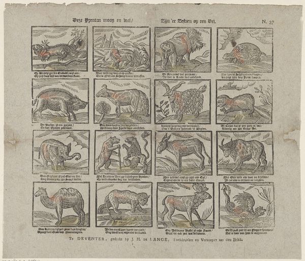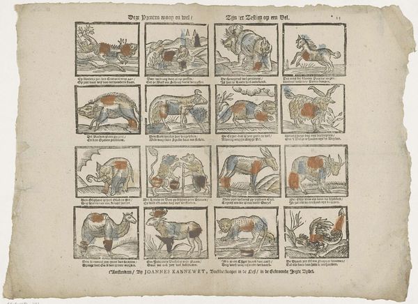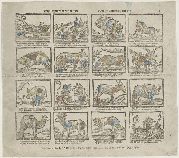 This hand-colored woodcut, titled "Here you see various cruel / wild and tame animals," was made by the widow Hendrik van der Putte. The image presents a grid of animals, each captioned with a short verse. It was produced in the Netherlands, likely during the 17th or 18th century, a time when printed images were becoming increasingly accessible to a wider public. The woodcut reflects a growing interest in the natural world, fueled by exploration and scientific inquiry. But this isn't a purely objective representation. The inclusion of verses suggests a moralizing intent, perhaps using animal behavior to comment on human society. The distinction between "cruel, wild, and tame" animals speaks to contemporary concerns about order, control, and the relationship between humans and nature. To fully understand this print, we might consult early natural histories, emblem books, and popular literature of the period. These sources can illuminate the cultural meanings attached to these animals and the social values that the artist, and the widow Hendrik van der Putte, may have been trying to convey.