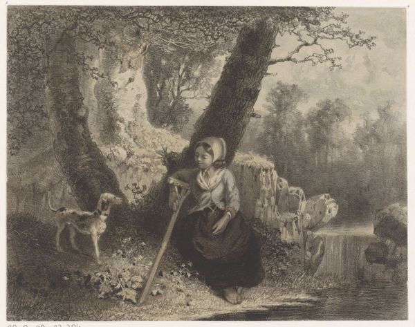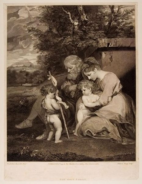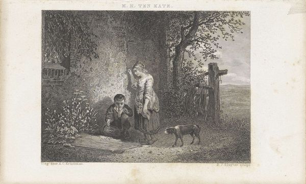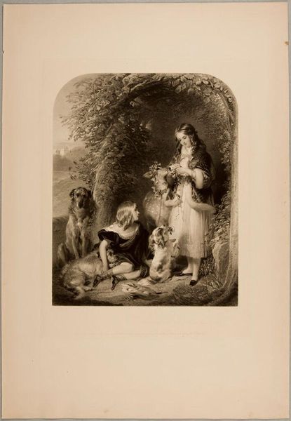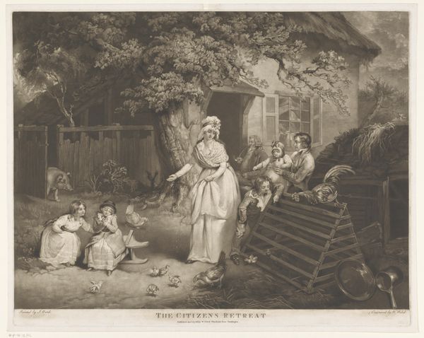 Curator: Here we have "Rustic Felicity", a charcoal drawing by James Ward. Its creation date isn't known, but its idyllic nature captures a specific yearning for a simpler, rural life. Editor: My initial feeling is one of staged pastoral serenity. The carefully arranged children, the docile donkey, even the perfectly placed pig under the wooden structure, it’s all so… calculated. Curator: It is undoubtedly a constructed scene, part of a larger Romantic movement trend that idealized country life, a world increasingly threatened by industrialization. Genre paintings such as these often depicted harmonious relationships between humans and nature. Editor: Precisely, I see how Ward employs a well-worn visual vocabulary. The children are garbed in white, signifying innocence, offering flowers, a gesture towards gentleness and purity. The donkey, a symbol of burden, appears at ease, suggesting harmony. The animals and children alike look clean, unburdened by mud, suggesting this is far from any real dirt farm. Curator: The historical context matters here. Ward was catering to a rising urban bourgeoisie hungry for images that reinforced comforting notions of the natural world as unspoiled. These images influenced perceptions and policies relating to the use and availability of agricultural space and goods. This work is meant to be consumed. Editor: It's interesting you note how calculated its design is; even its composition carries significance. Look at the framing – the sheltering tree on one side and the gate on the other create a contained idyllic space that suggests a world free from external concerns. Curator: And consider the medium – charcoal drawing, allowing for soft gradations and tonal contrasts. The scene is not overly saturated, which contributes to its dreamlike quality, reinforcing its departure from material realities and further highlighting an elevated view of rural life, made safe for urban sensibilities. Editor: A controlled, crafted dream… That contrast underscores Ward's skillful use of symbols, the deliberate visual choices meant to evoke specific emotions in a middle-class viewer: a comforting return to nature without any of its hardships. It serves as both a longing and a gentle reassurance for its audience. Curator: It's a powerful reminder of how even seemingly simple images are carefully constructed messages meant to resonate within a very specific social context. Editor: Indeed, analyzing the iconography reminds us that art, especially art seemingly as innocent as this, rarely reflects raw nature without some degree of filtering.